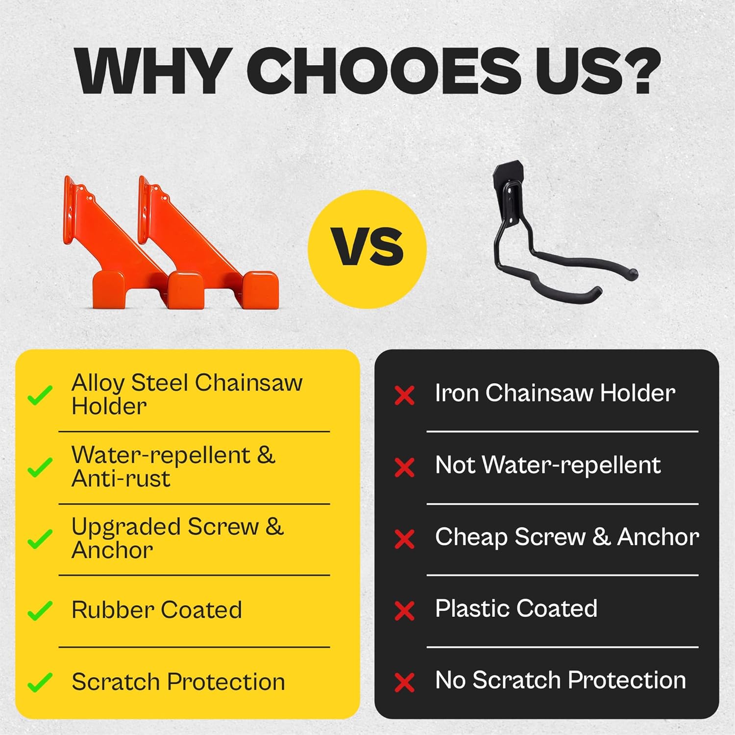 - Anti-Rust & Anti-Scratch Protection – Finished with a rust-resistant coating and lined with anti-scratch pads, this hanger keeps your chainsaw and tools protected from wear, corrosion, and wall damage—so your gear stays in top shape longer.