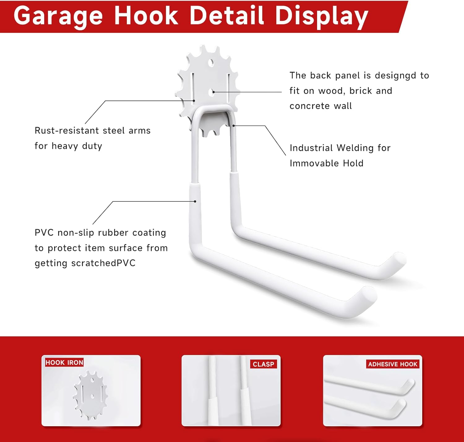 - Package Included: This set includes 4 double hooks in 2 different sizes: 2 large J hooks, 2 large U hooks, versatile J/U-hooks maximize space with reliable grip.You can create an efficient storage space—perfect for your garage storage system