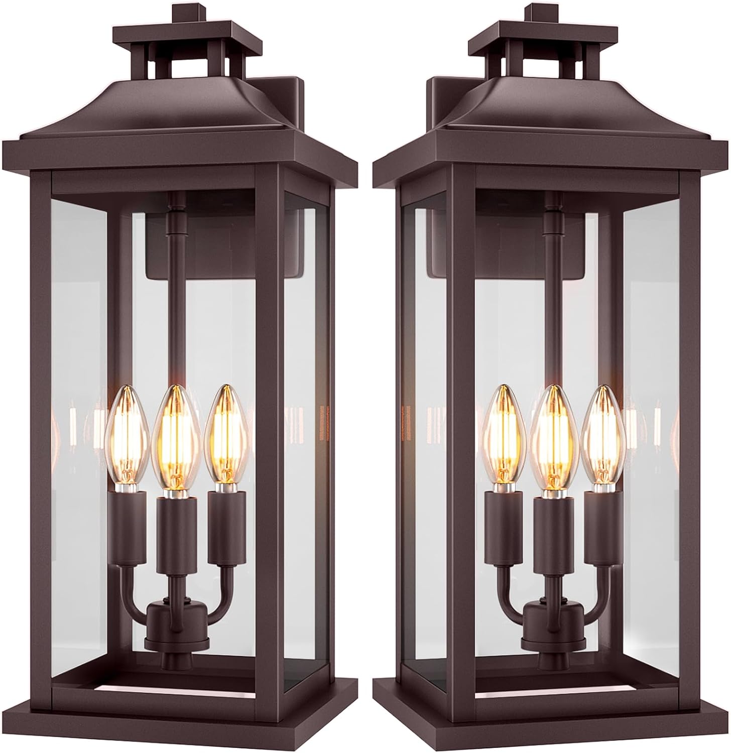 - 【Exterior Wall Sconce Lights with 3-Light Design】The unique top design of 2-Tier Roof makes the visual effect better and transform ordinary space into breathtaking showcase. Substantial 3-light socket design, our 20 inch bronze outdoor wall lights combine durability with aesthetics, easily for ambience customization. Our clear tempered glass distributes illumination evenly. Perfect for brown porch lights, bronze garage lights, garden pathway lights and any other outside lanterns.