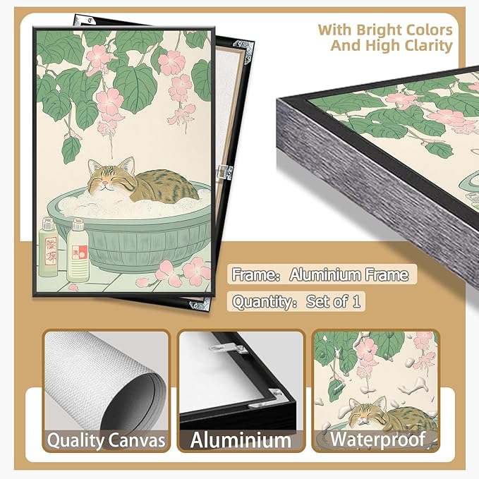 Vintage Tabby Cat in Bathtub Wall Art Funny Japanese Poster Print Relaxation Decor Cute Animal Pet Canvas Neutral Japan Painting for Bathroom Dorm Room Home Aesthetic 16x24inch Metal Black Frame