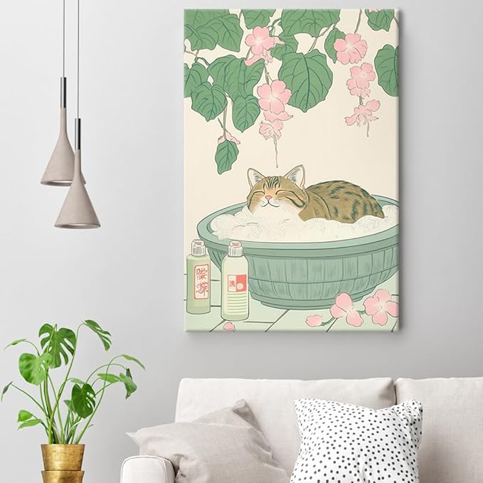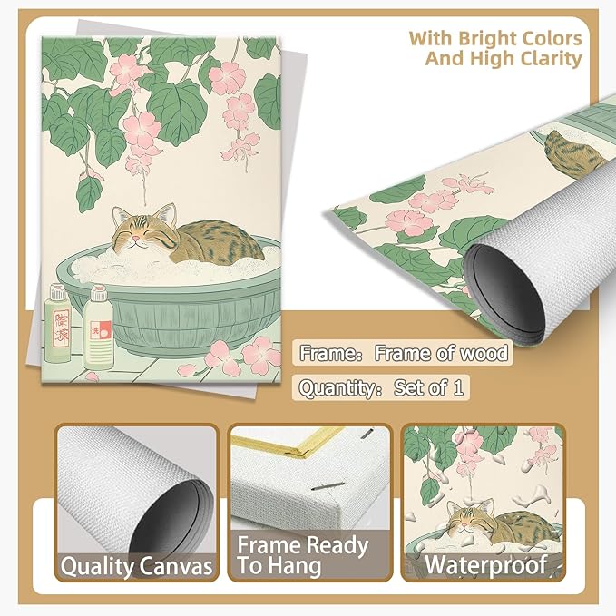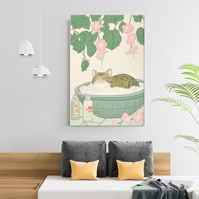 Vintage Tabby Cat in Bathtub Wall Art Funny Japanese Poster Print Relaxation Decor Cute Animal Pet Canvas Neutral Japan Painting for Bathroom Dorm Living Room Home Aesthetic 24x36inch Framed