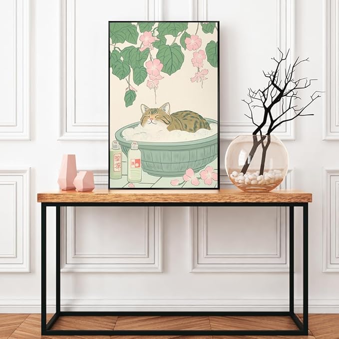 Vintage Tabby Cat in Bathtub Wall Art Funny Japanese Poster Print Relaxation Decor Cute Animal Pet Canvas Neutral Japan Painting for Bathroom Dorm Room Home Aesthetic 20x30inch Metal Black Frame