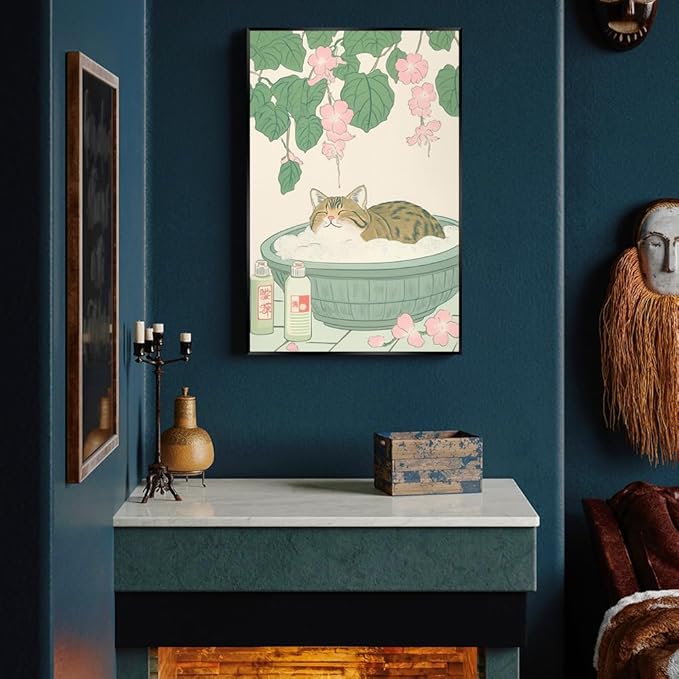 Vintage Tabby Cat in Bathtub Wall Art Funny Japanese Poster Print Relaxation Decor Cute Animal Pet Canvas Neutral Japan Painting for Bathroom Dorm Room Home Aesthetic 24x36inch Metal Black Frame