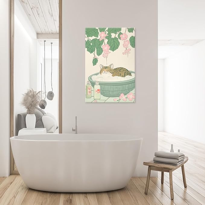 Vintage Tabby Cat in Bathtub Wall Art Funny Japanese Poster Print Relaxation Decor Cute Animal Pet Canvas Neutral Japan Painting for Bathroom Dorm Living Room Home Aesthetic 16x24inch Framed