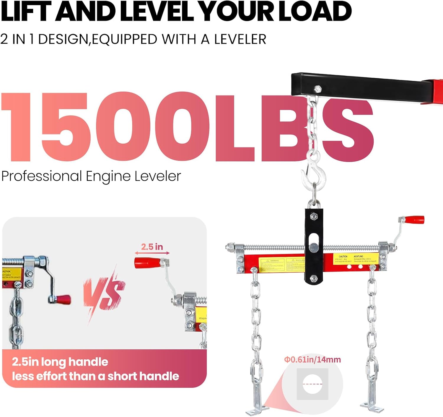 - 【Adjustable Boom】With four adjustable boom positions, the engine hoist cherry picker offers multiple lifting options (1100/2200/3300/4400 pounds). This allows you to meet different lifting requirements for various applications, making it ideal for lifting heavy engine lifts in both commercial and residential settings.