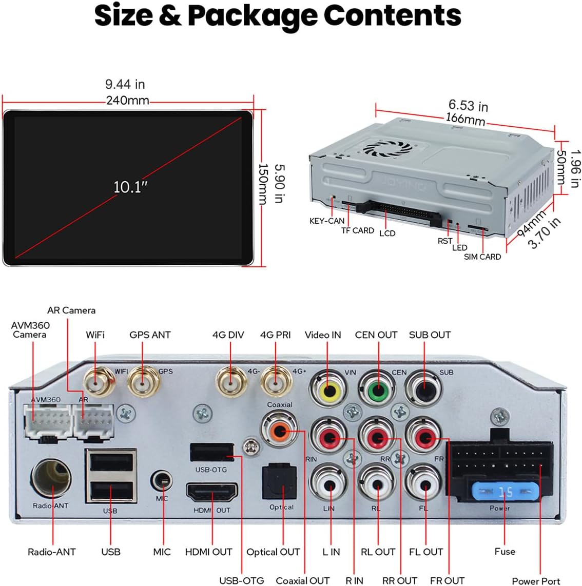 - Included Components : 10.1" radio*1, Single Din Cage*1, Mounting Sleeve*1, Left & Right Bracket*1, Plastic Trim Out*1, Extraction Keys*1, Installation Manual*1, WiFi Antenna*1, GPS Antenna*1, 4G Antenna*2, External Mic*1, USB Cable*2, AR Cable*1, Screen Ribbon Cable*1, ISO Cable *1, User Manual*1 10.1" radio*1, Single Din Cage*1, Mounting Sleeve*1, Left & Right Bracket*1, Plastic Trim Out*1, Extraction Keys*1, Installation Manual*1, WiFi Antenna*1, GPS Antenna*1, 4G Antenna*2, External Mic*1, USB Cable*2, AR Cable*1, Scr… See more