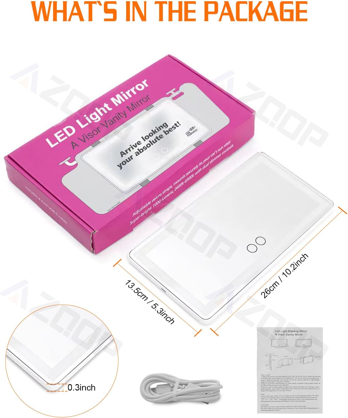 - Package Include - 1Pc USB to Type-C port charging cable, 1pc user manual, 1pc car sun visor vanity mirror. If you have any questions, please feel free to contact us.