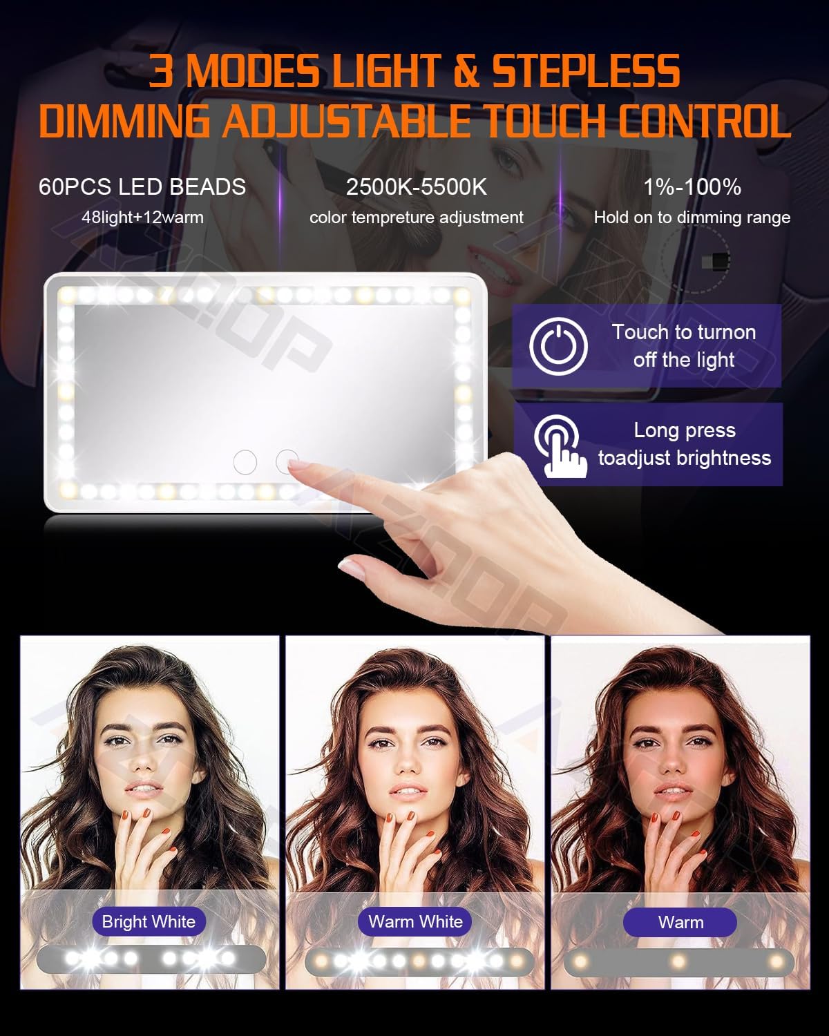 - Car Vanity Mirror with 3 Modes Light - AZQOP car mirror vanity has three lighting modes: white, warm, and white+warm. You can adjust the color of the lights by short pressing the two sensitive buttons on the screen, and long pressing can adjust the brightness, always finding the right light for you.