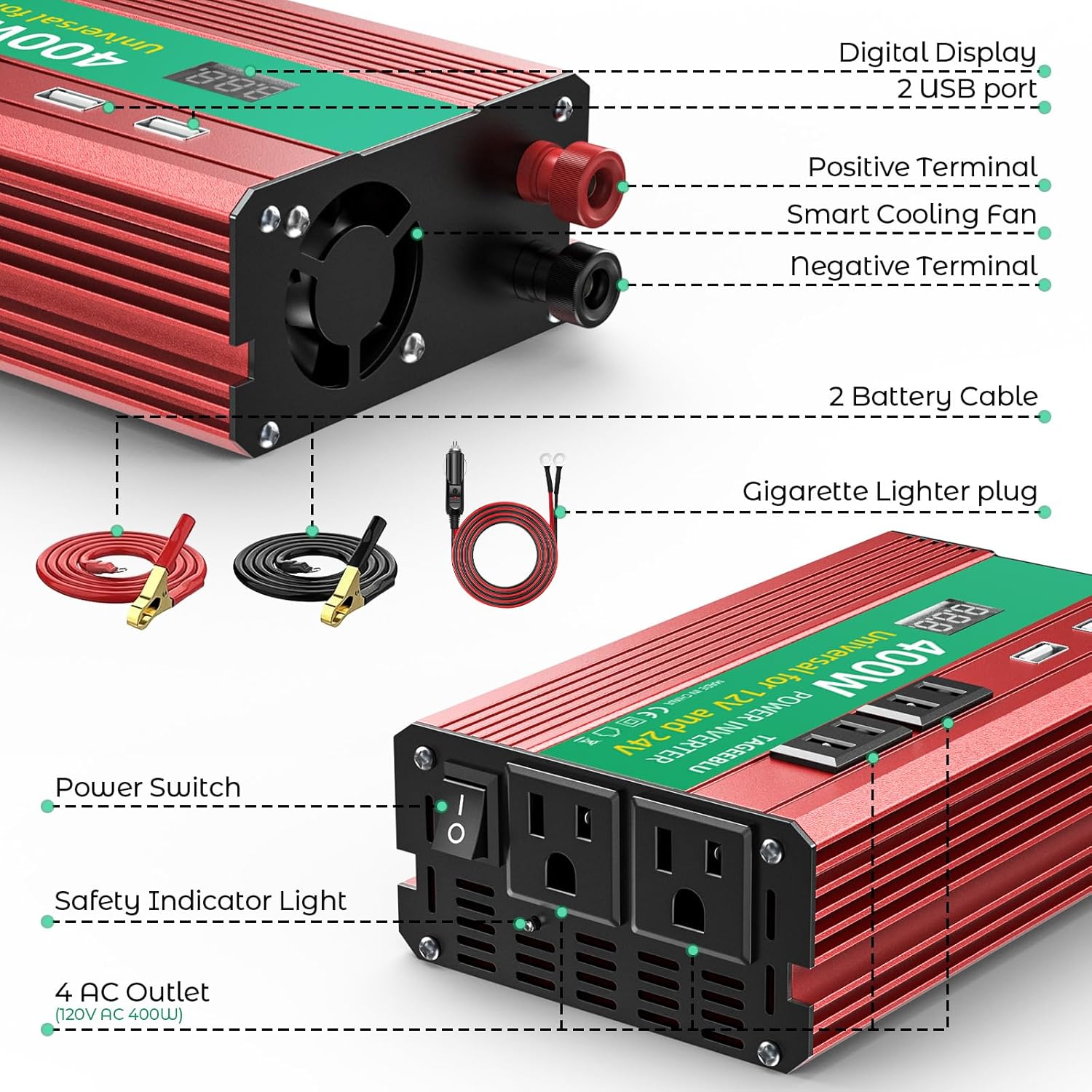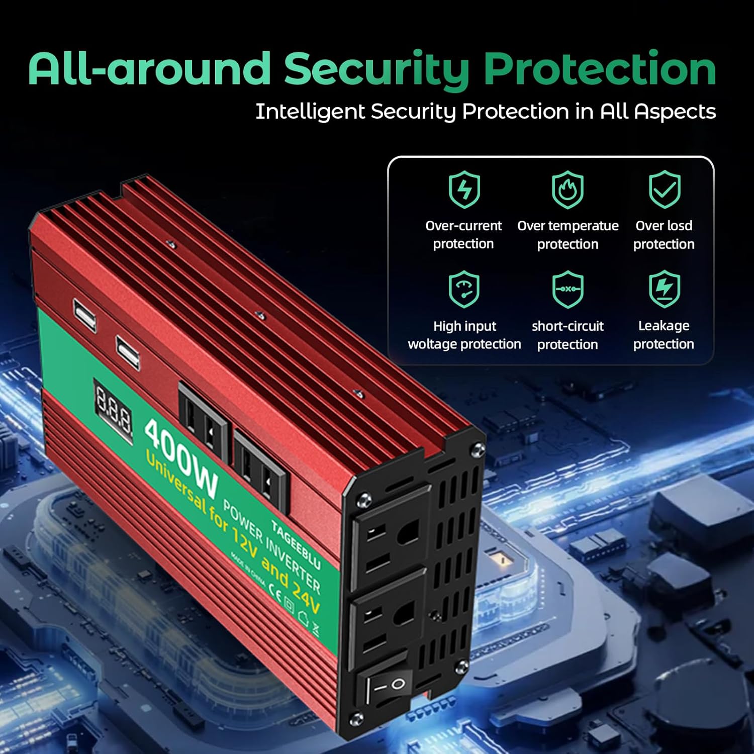 - 【Safety Multi-Protection】400W 12V/24V Automobile Inverter Overload / Short Circuit / Over heat / Reverse Polarity / Under or Over Voltage protections.Applies the technology of crashworthiness, robust, as well as good electrical insulation auto inverter