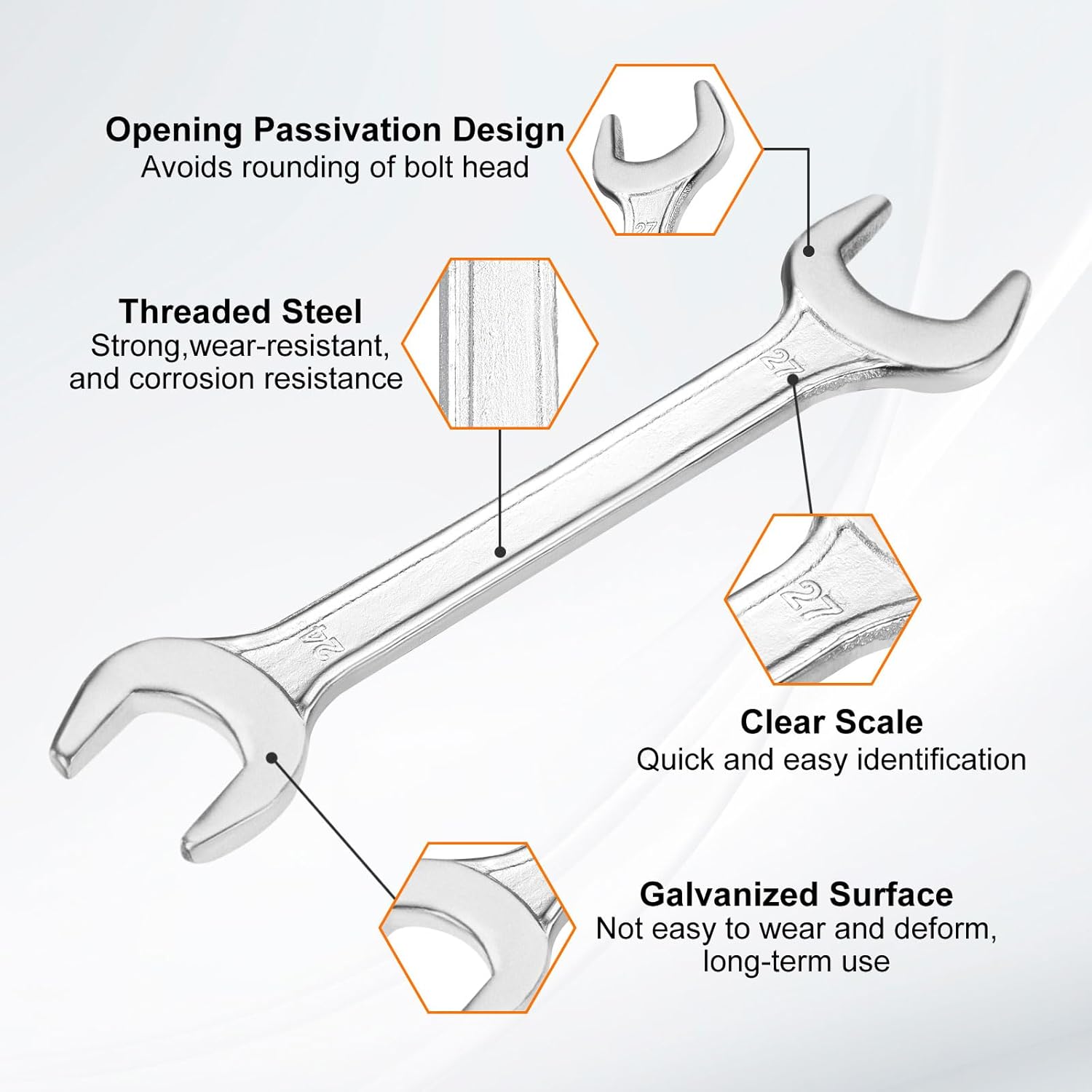 - Material - Our double open-end wrench is made of threaded steel with high hardness and excellent wear resistance. The surface galvanizing improves its wear resistance, keeps its surface smooth and reduces wear, is not easy to deform, and can be used for a long time.