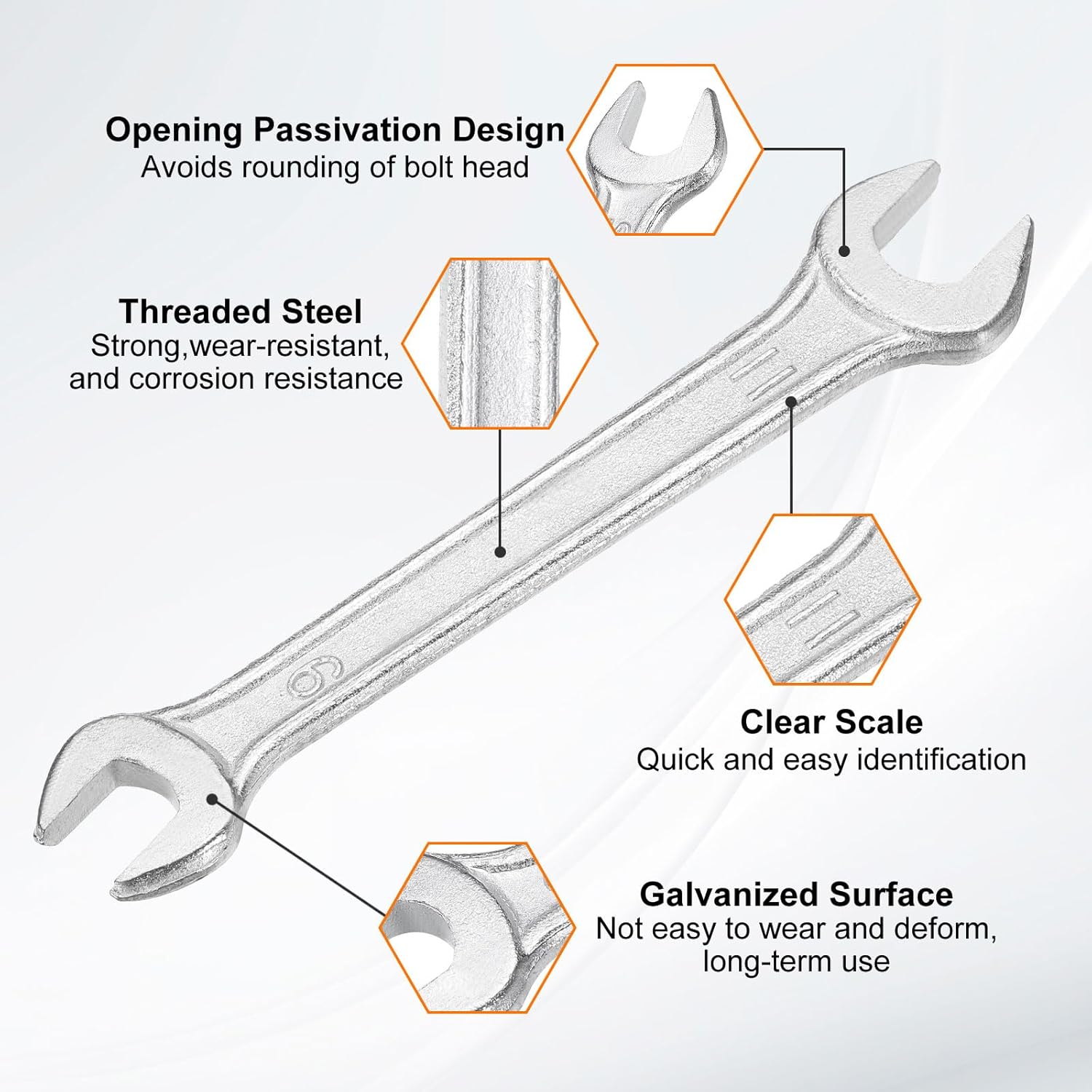 - Material - Our double open-end wrench is made of threaded steel with high hardness and excellent wear resistance. The surface galvanizing improves its wear resistance, keeps its surface smooth and reduces wear, is not easy to deform, and can be used for a long time.