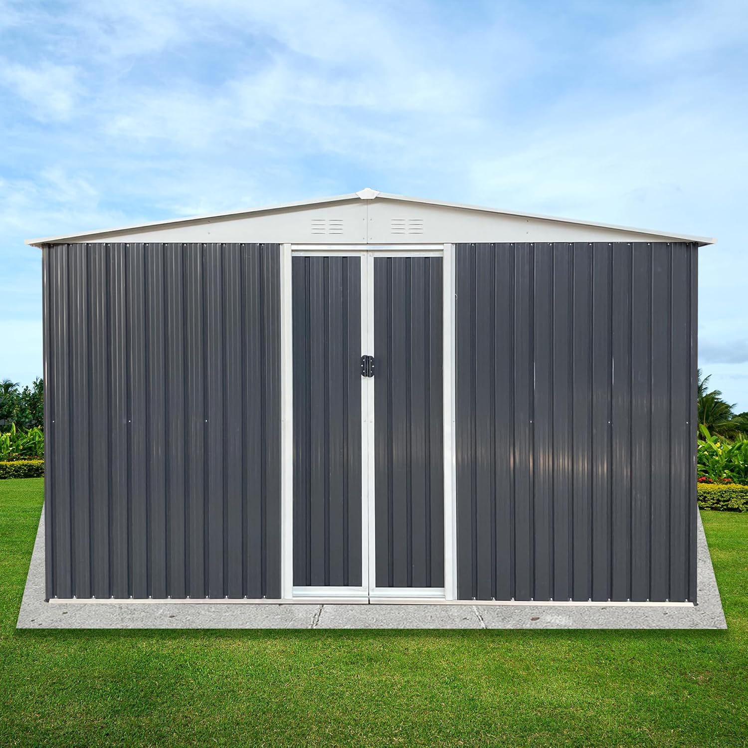 - ๐ก๐๐ฅ๐ฅ-๐ฐ๐๐๐ญ๐ก๐๐ซ ๐๐ญ๐จ๐ซ๐๐ ๐ ๐๐ก๐๐: Our metal shed 10x12 features smooth, lockable sliding doors with handles for easy opening and closing. This practical storage building is perfect for storing gardening tools or serving as a warm pet house. The sloped roof effectively prevents leaks and snow buildup, while the four transparent side windows provide soft natural light. Four vents improve airflow, keeping items dry and well-preserved in any weather conditions