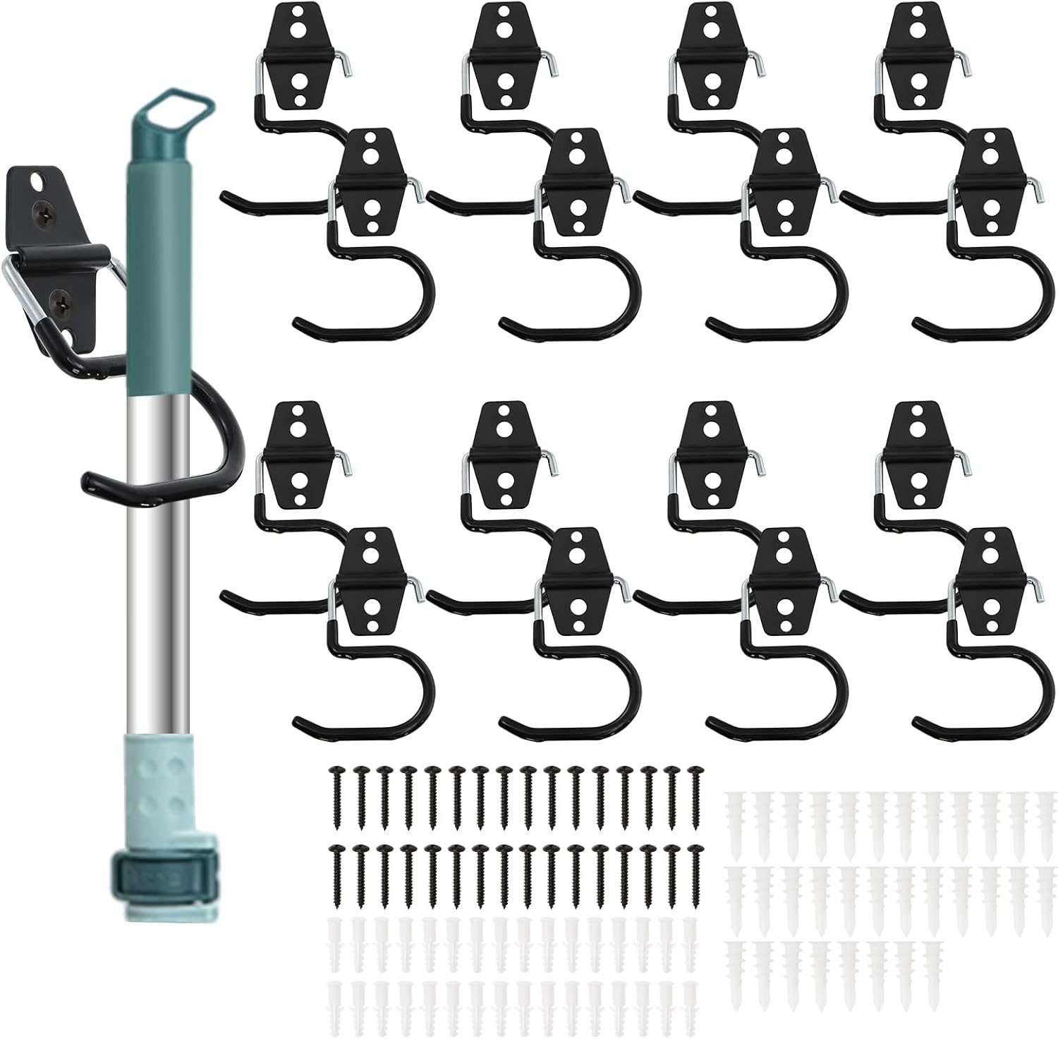 - Easy Installation: These metal garage hooks come with two types of screws, including 16 sets of screws and wall plugs to install on brick and wood walls or drywall. The metal garage hook nicely holds a variety of handle sizes and keeps firmly.