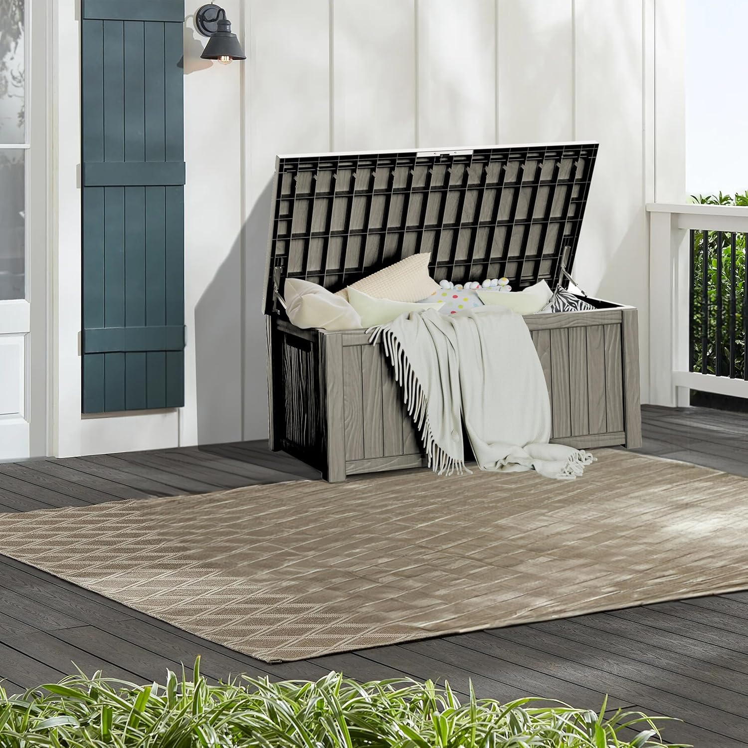 - Large Capacity: This 150-gallon deck box offers ample storage space for your outdoor accessories, and it has a 600-pound weight capacity and can be used as a separate patio seat or indoor table.