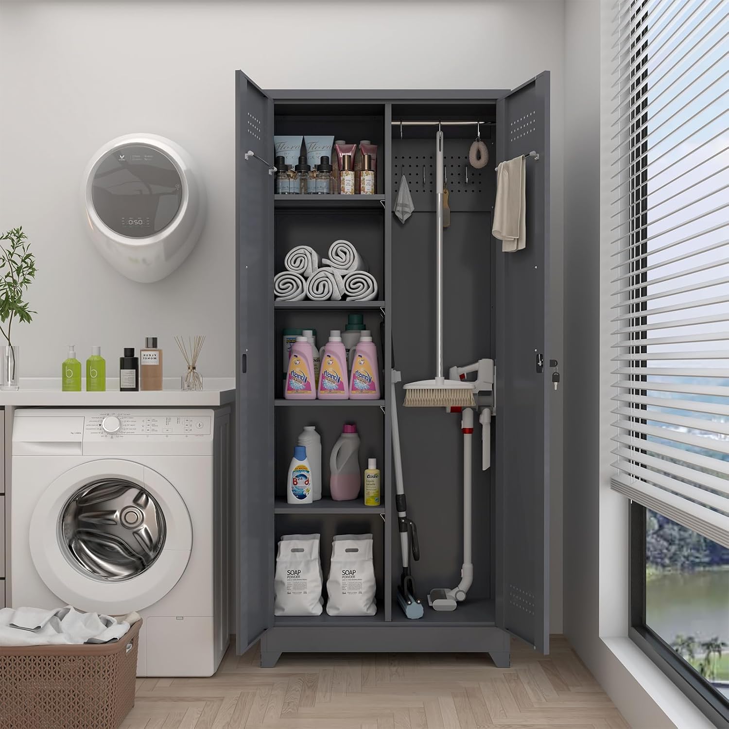 - 【Versatile Use】This cleaning metal storage cabinet comes with multiple accessories to meet your needs. Adjustable shelves accommodate items of varying heights. The right side is equipped with a hanging rod and S-hooks, and the hanging rod on the door can be used for towels and other items. The perforated panel design makes it easy to store and retrieve tools, keeping the space tidy and organized. The cabinet can store documents, brooms, mops, tools, towels, clothes, and more.