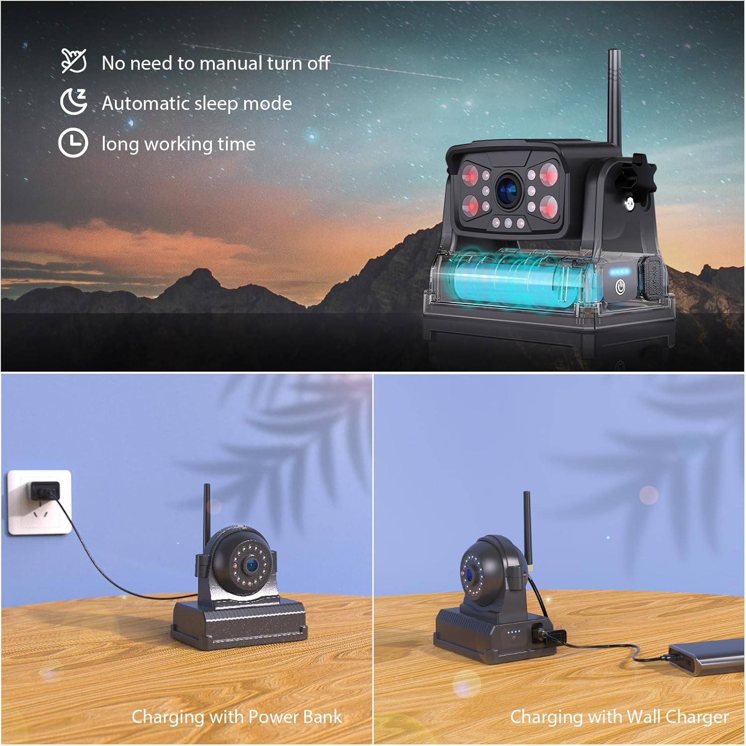 - 🔋 Rechargeable Portable Camera: Rechargeable battery supports up to 10+ hours of continuous use (or plug into 5V power). No need to tap into the vehicle’s electrical system—just mount and power on. Just power on/off the monitor to turn the camera on/off from inside the cab, this will reduce the frequency of charging the trailer camera. Works even if the vehicle’s power fails, ensuring uninterrupted recording.
