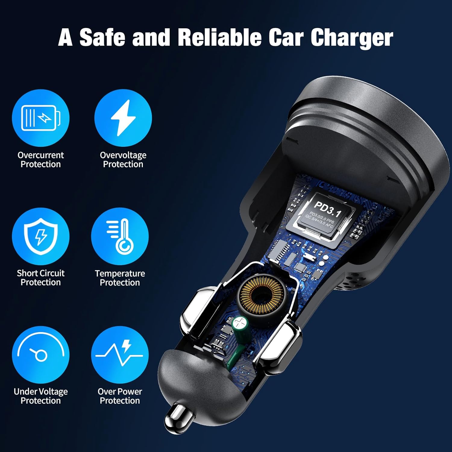 140W USB C Car Charger, Super Fast Charging for iPhone 16 Pro Max/MacBook Pro/Air/Samsung S25, Drone, PD3.1&PPS 45W Type C Cigarette Lighter Adapter, Laptop Car Charger with a 100W E-Mark Cord