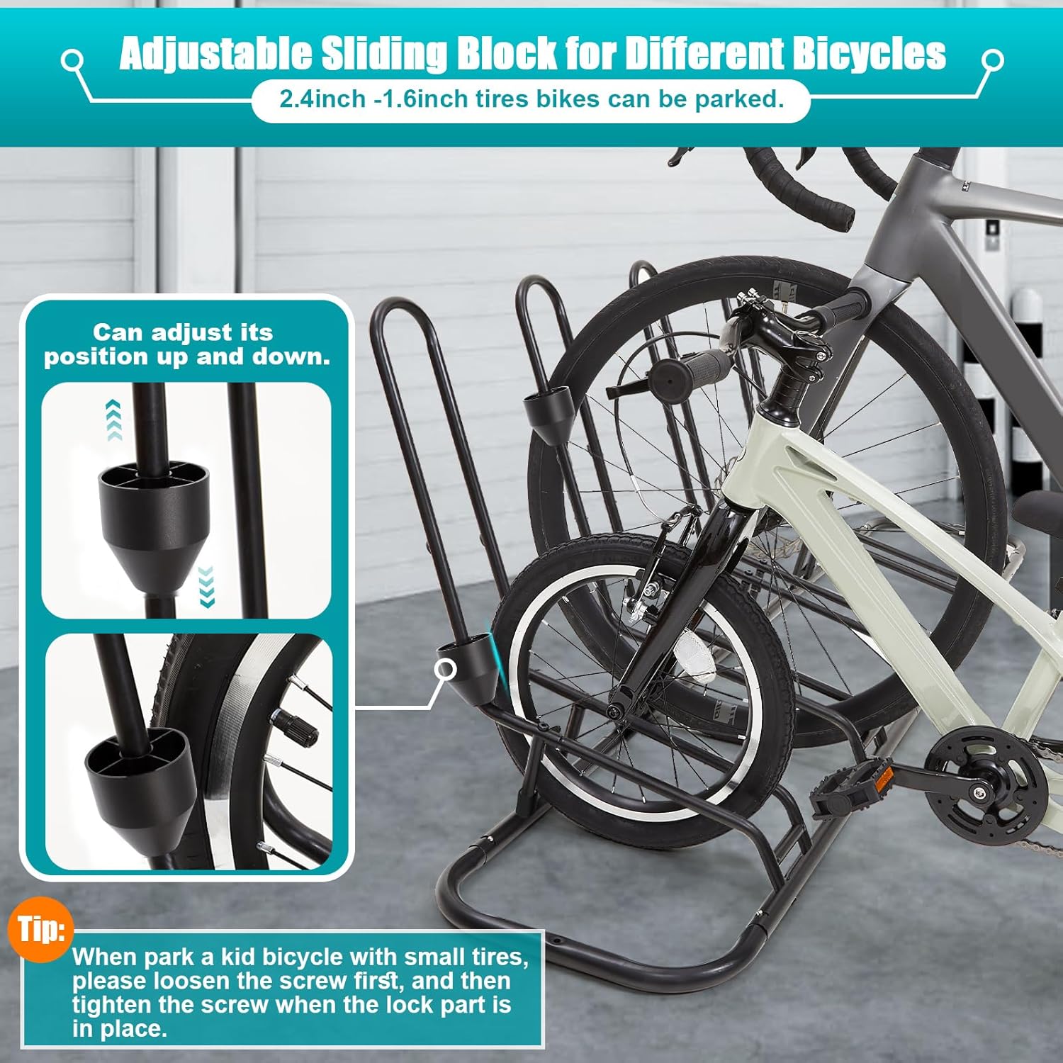 - Suitable for Most Bikes: Our bike stand fits 12" - 29" bikes with up to 2.4" wheel width. Hold up to 4 bikes. It is ideal for storing mountain bike, road bike, kids bike, beach cruisers etc. Can use in garage, porch, indoor, outdoor, or backyard. Dimensions: 57.4"L x 14.4"W x 24"H
