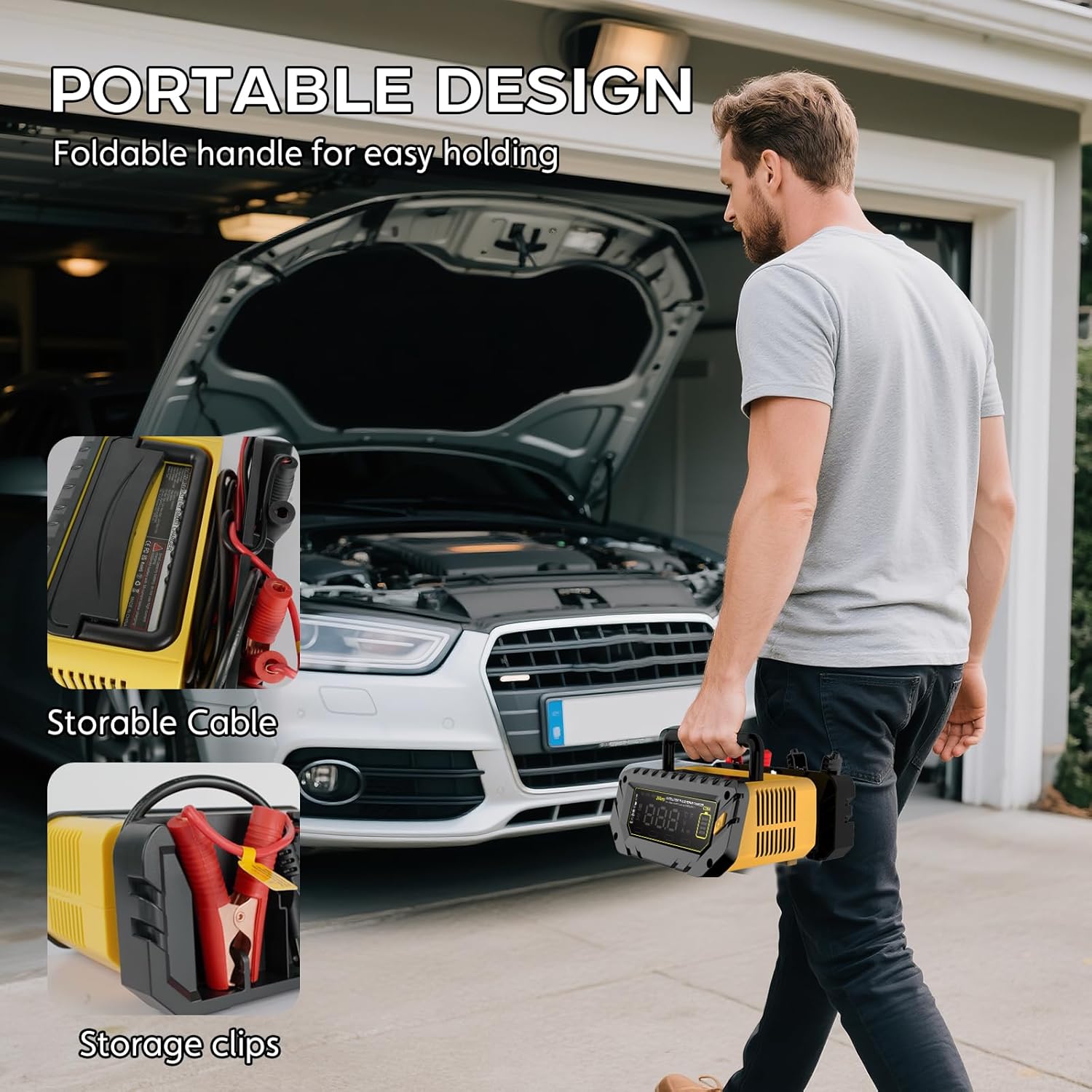 - 【Handle Design & Multiple Batteries】C26A car battery charger adopts a handheld design, with a novel and convenient appearance for carrying. It can charge 6V/10A max, 12V/26A max, 24V/13A max car batteries. Large LCD screen with digital display design and multi-color display for easy reading.