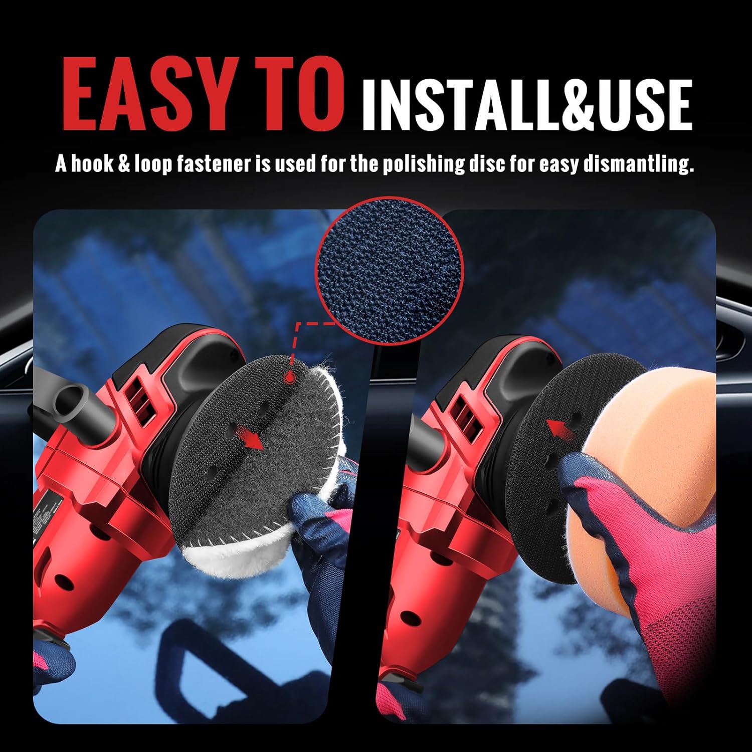 - 【POWERFUL BRUSHLESS MOTOR】Equipped with an efficient pure copper brushless motor, the polisher can provide a power up to 900W. Unlike other brush motors, the brushless motor needn’t replace the carbon brush. Besides, the motor features incomparable durability and optimal speed for favorable stability, lower noises and vibration of the cordless polisher, and comfortable, quiet working environment.