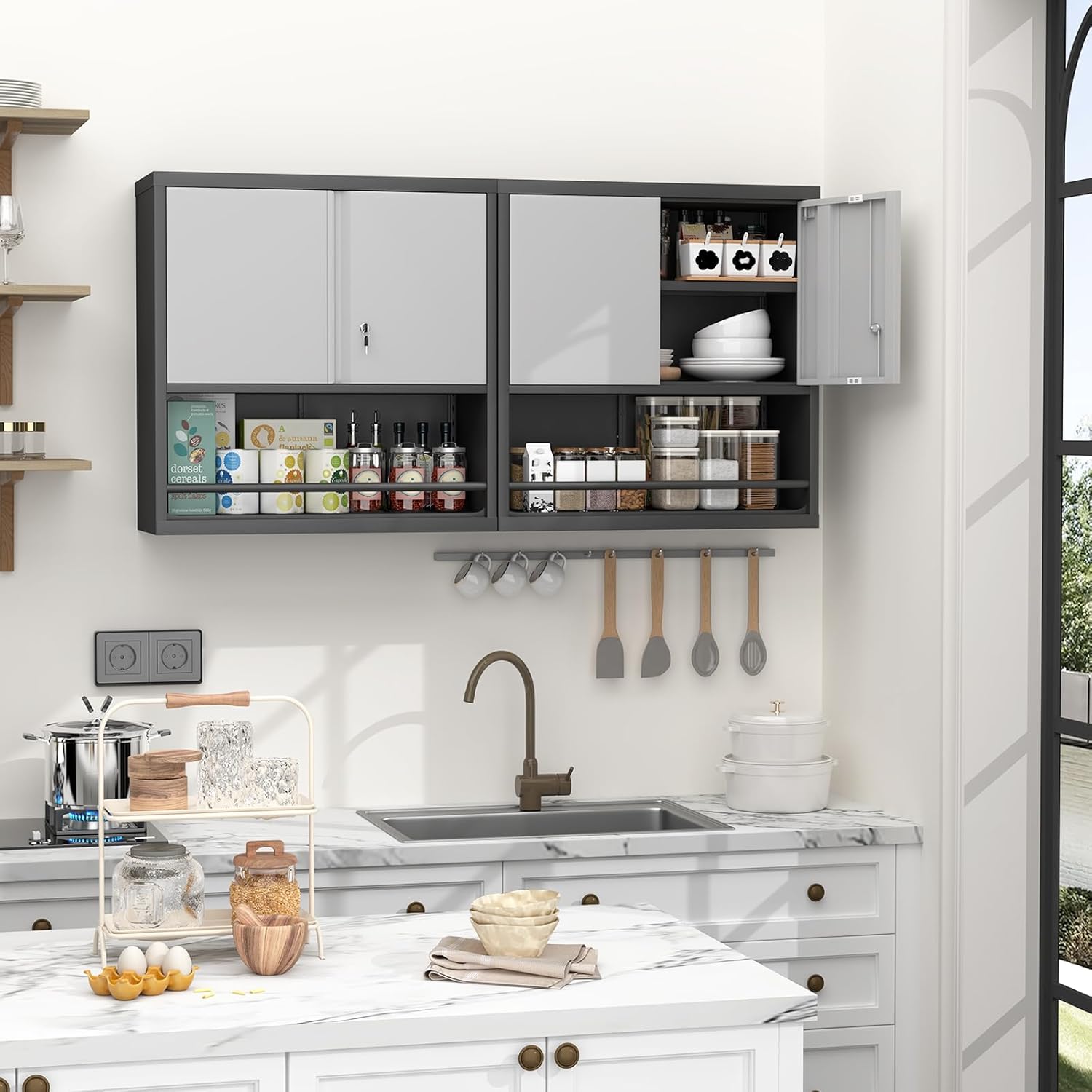 GREATMEET 31" H Metal Garage Storage Cabinets,Wall Cabinet Storage,Lockable Wall Mount Cabinet, Metal Wall Cabinet for Garage Office Utility Room, Black&Grey