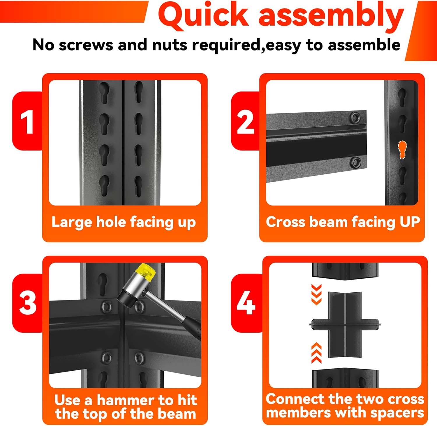 - 【10-Minute Easy Assembly & Thoughtful Service】No nuts or bolts needed—effortlessly assemble each standalone garage shelf in minutes! To simplify setup, we include a hammer and gloves. Plus, enjoy 24/7 customer support with every purchase. If any parts are damaged or missing, contact us for a swift resolution within 24 hours