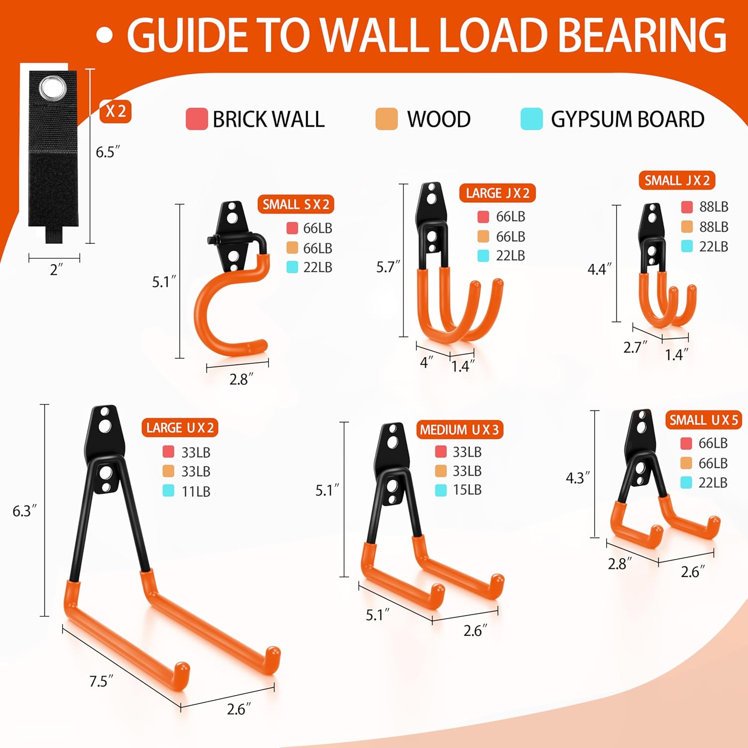 - Versatile Sizes: Our collection includes 16 heavy-duty garage wall hooks in 6 different sizes, featuring an assortment of small and large U-shaped, J-shaped, and S-shaped hooks, along with 2 extension strap storage belts for hanging various tools of different sizes and weights.