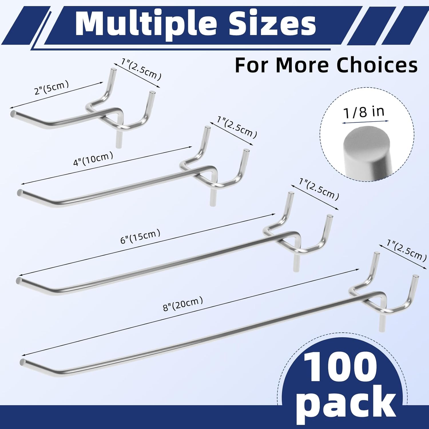 100 Pack Pegboard Hooks Heavy Duty 2 4 6 Inch Pegboard Hooks 1/8 Stainless Steel Peg Board Shelving Hanging Tool Pegs Organizer Accessories Kit for Garage Kitchen Store Craft Organizing Wall Storage