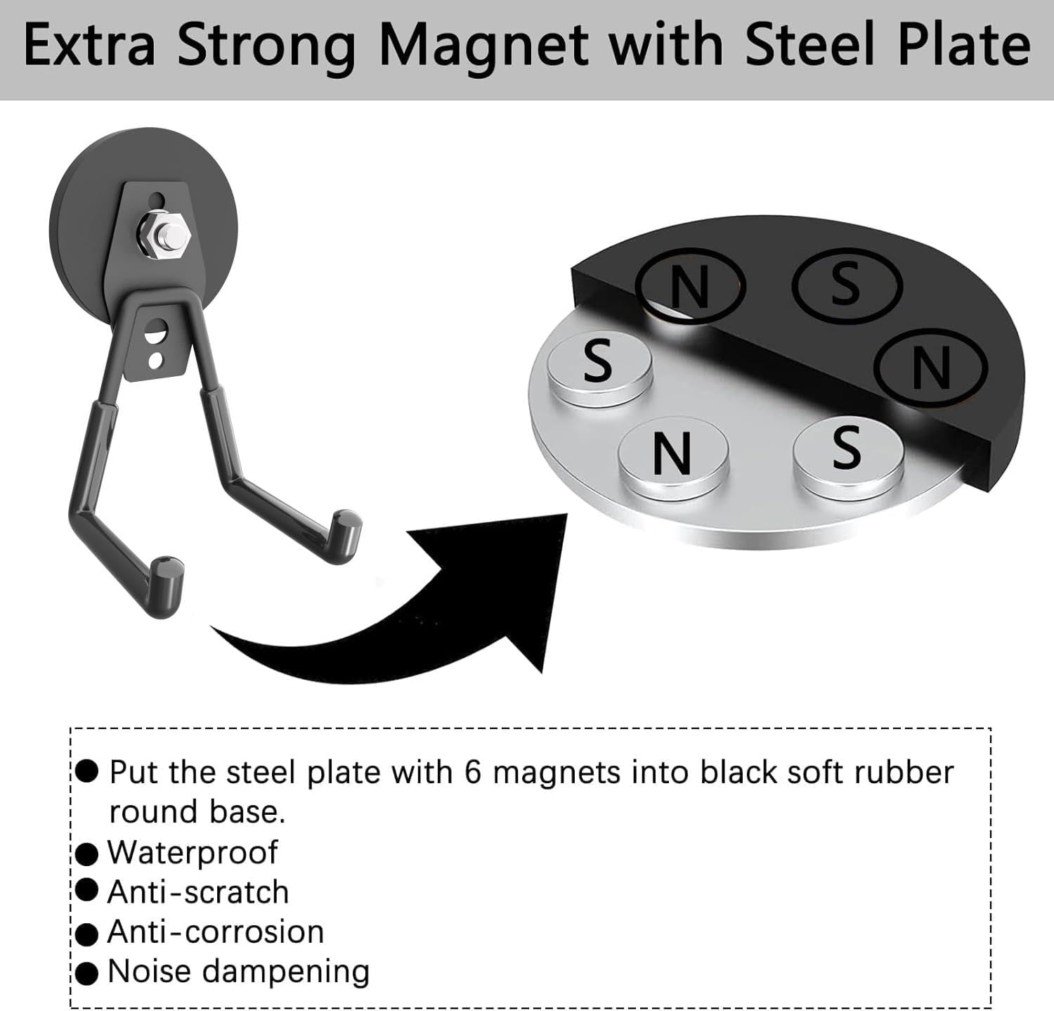 - 🧲[Large Storage Magnetic Hooks]:These magnetic hooks includes 2 (2.6inch) strong magnet base with threaded bar, spacers,nuts and 2 PVC coated medium L hooks. We tested that our medium L magnetic hook can hold any kind of EV charger,more than one gallon bottled water, any kind of garage tool,drill, toolbox etc.