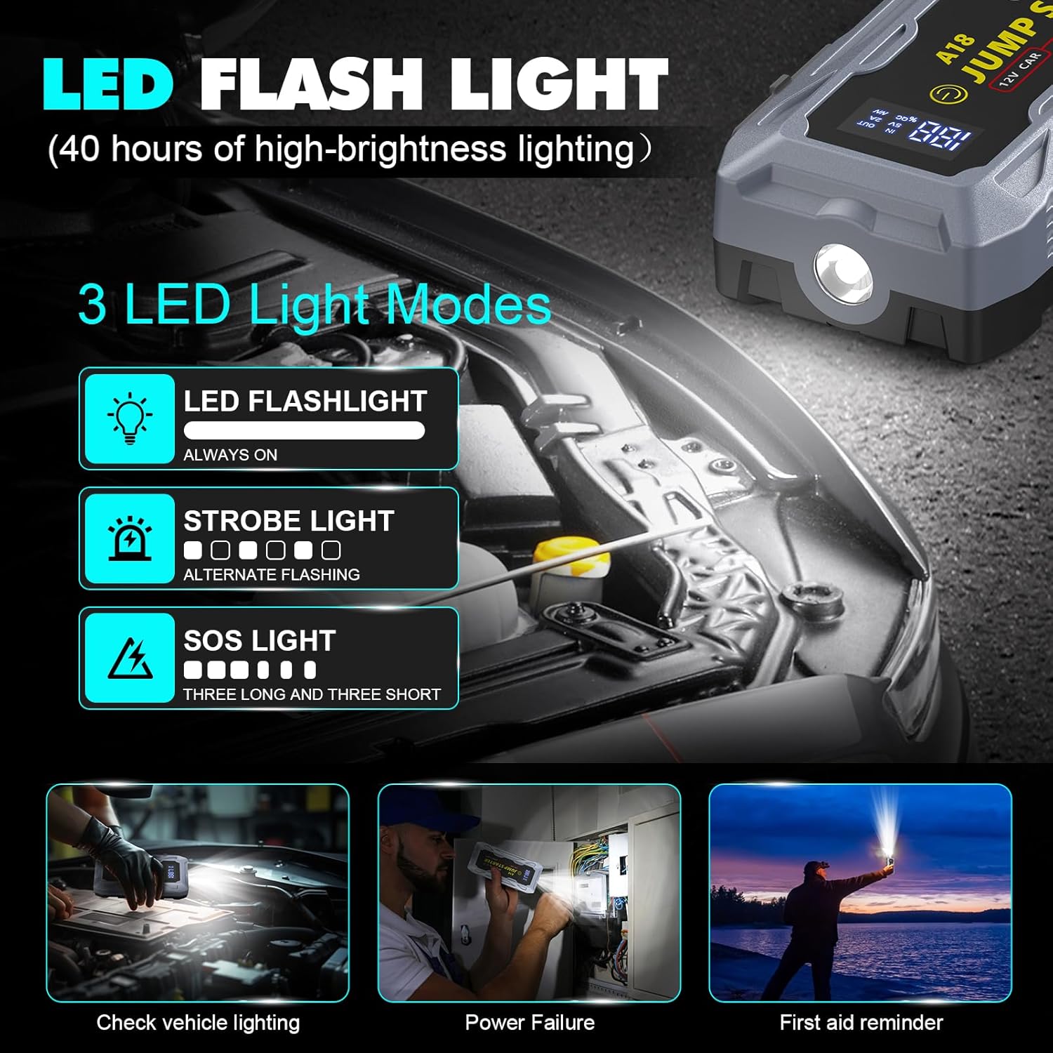 - 【Ultra-Bright 200-Lumen LED Flashlight – Your Emergency Companion】 Equipped with a powerful 200-lumen LED flashlight, featuring three lighting modes (Flashlight, SOS, Strobe), QQZJ ensures you’re never left in the dark. Whether you're jump-starting at night, dealing with a roadside emergency, or camping outdoors, this car jumper starter portable is your reliable backup light source.