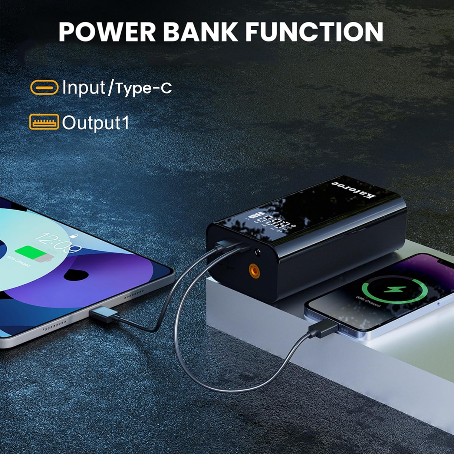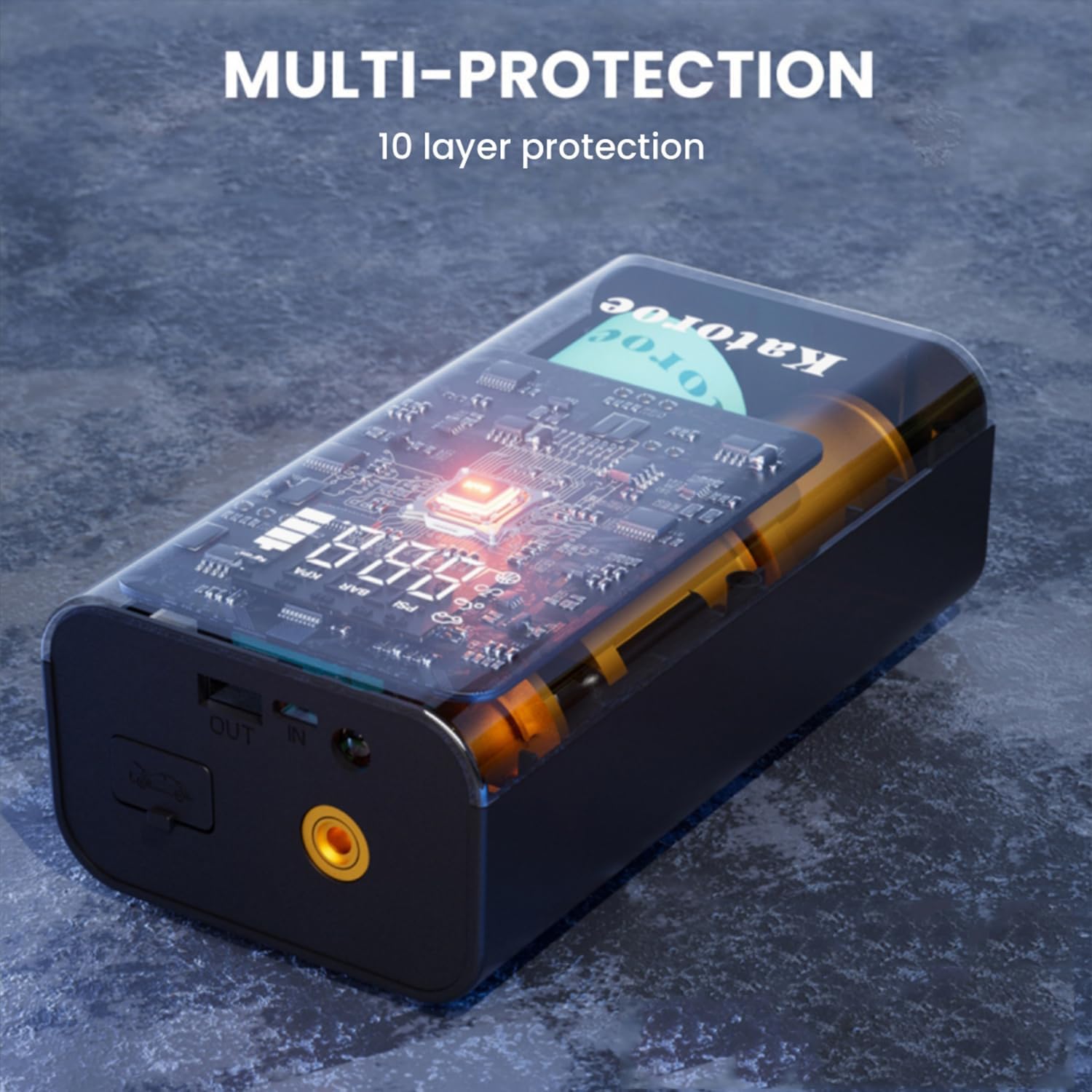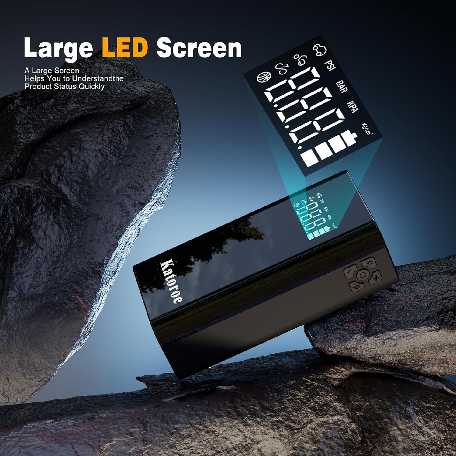 - 【10-IN-1 JUMP STARTER】Car battery jump starter can jump start max up to 80 times on a single full charge.It also have 10 practical function: such as jump starter, tire Inflator, power bank, screen display, tire pressure detection, unit switching, 3-mode lights (Flashlight, SOS, Strobe). In addition, the display screen will show real-time data, making it convenient to start the car and tire inflate.
