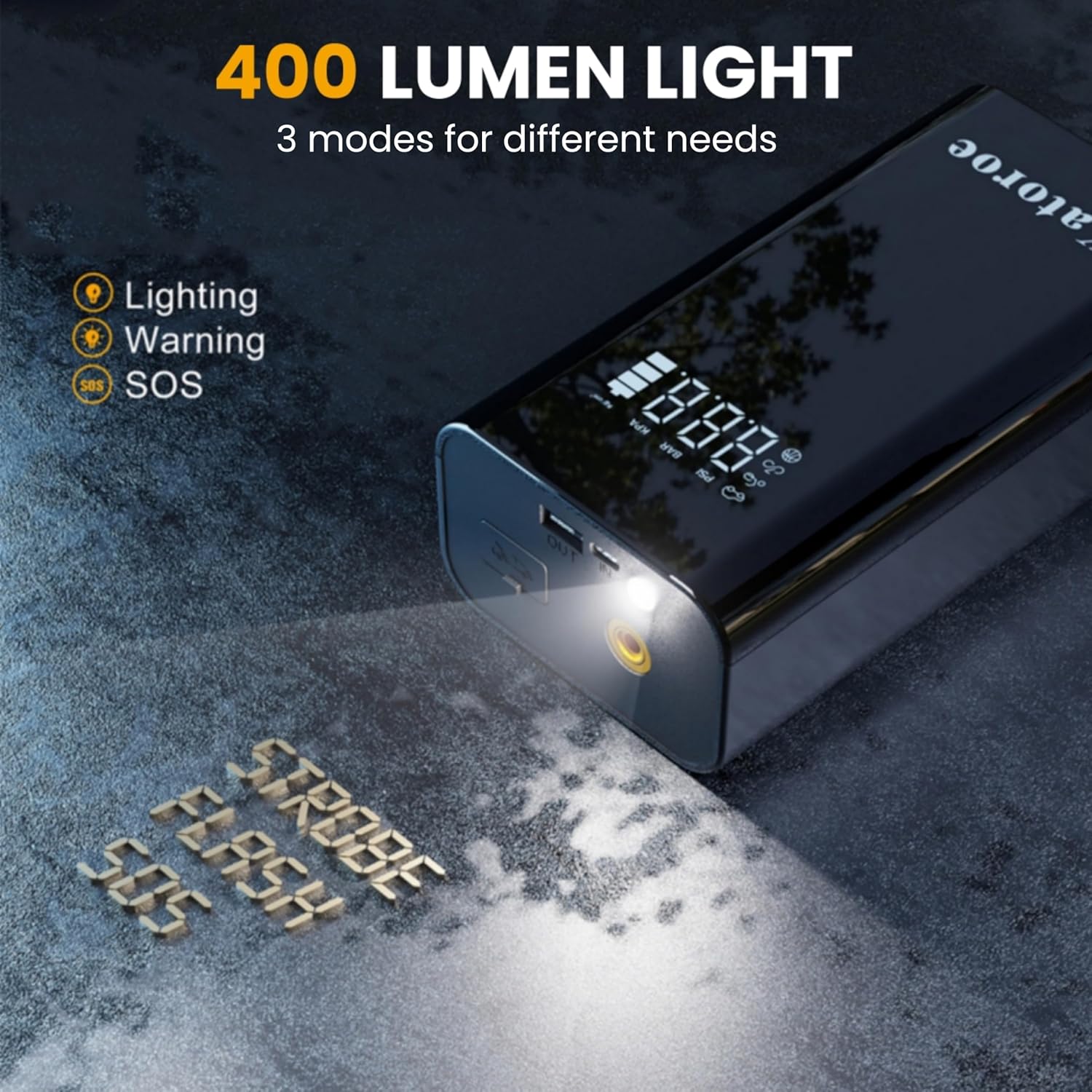 - 【EMERGENCY LIGHTS】The jump starter battery pack is featured with 400 lumens LED lights, significantly providing 300%+ brightness and can be used for long time. 3 modes lights are for different emergency scenarios.