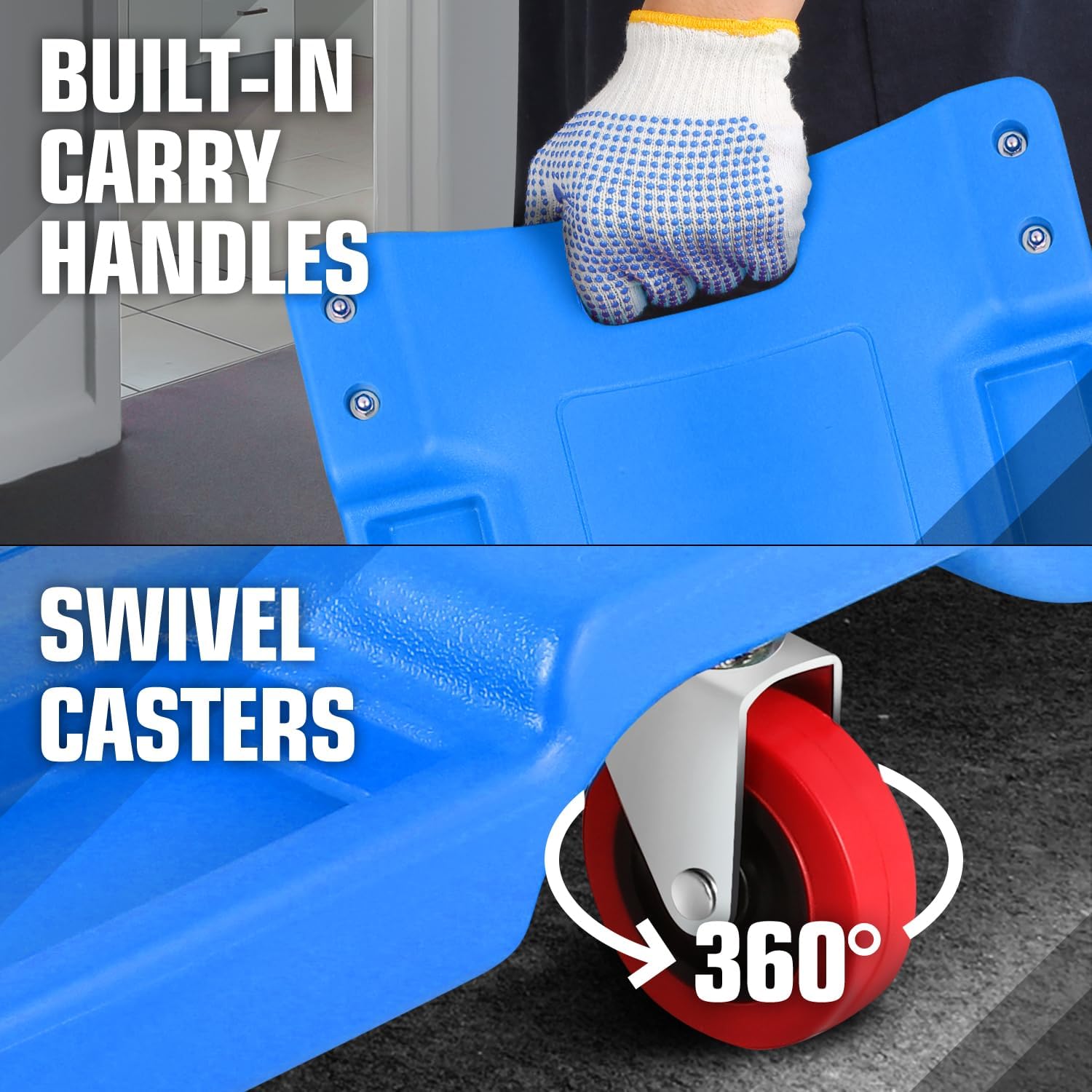 - 36" Long X 17" Wide X 4.25" H Overall Size; 6 X 2.5" Diameter Non Marring Polyurethane Swivel Caster Wheels; Low Profile 4.25" Height for Increased Clearance Under Vehicle