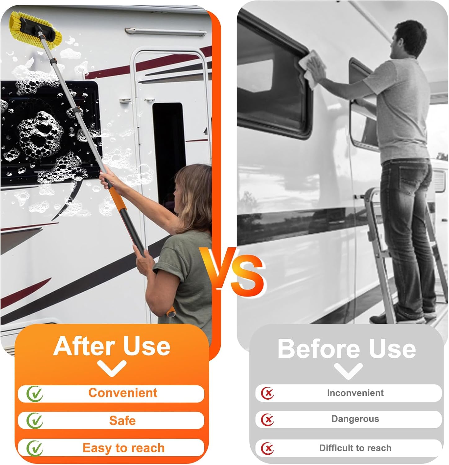 - Ultra-Long Telescoping Range for Easy Access to High Areas: The LAANPOLE car wash brush features a telescoping pole design that adjusts from 5FT to a maximum of 16FT. This allows you to reach higher areas with this car wash brush with long handle while standing up, eliminating the need for a ladder when cleaning the top of vehicles and other hard-to-reach areas. The design of the car brush makes high-area cleaning easy