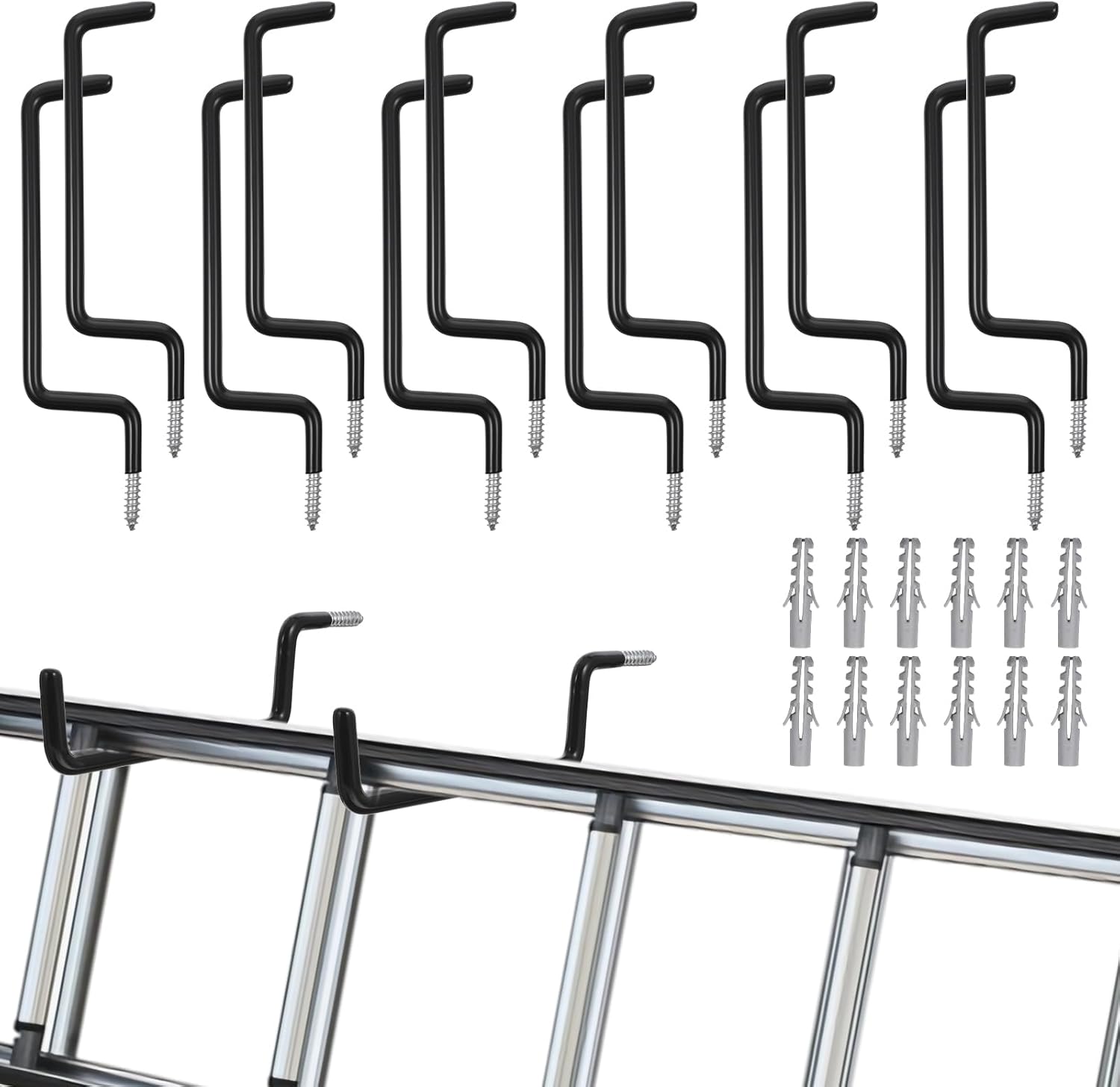 12 Pcs Heavy-Duty Black Ladder Hooks – Iron & PVC Wall Mount Storage Hangers for Bike, Ladder, Chair, Tools (75 lbs Capacity)