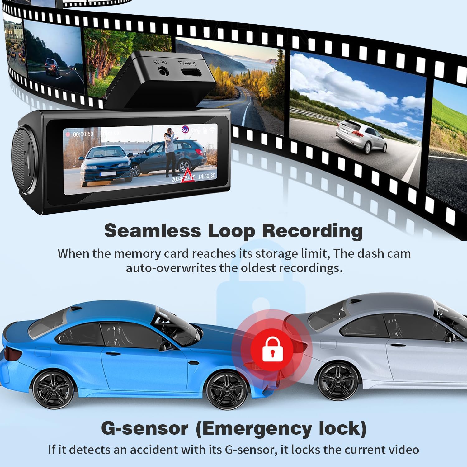 - 【256GB Support & Zero-Risk Purchase】Never Miss a Moment: Loop recording auto-overwrites old files (supports 256GB cards). For your absolute satisfaction, our dash camera is tested in real life for thousands of time. 18-Month Warranty: Free replacement/refund if unsatisfied + lifetime firmware upgrades.
