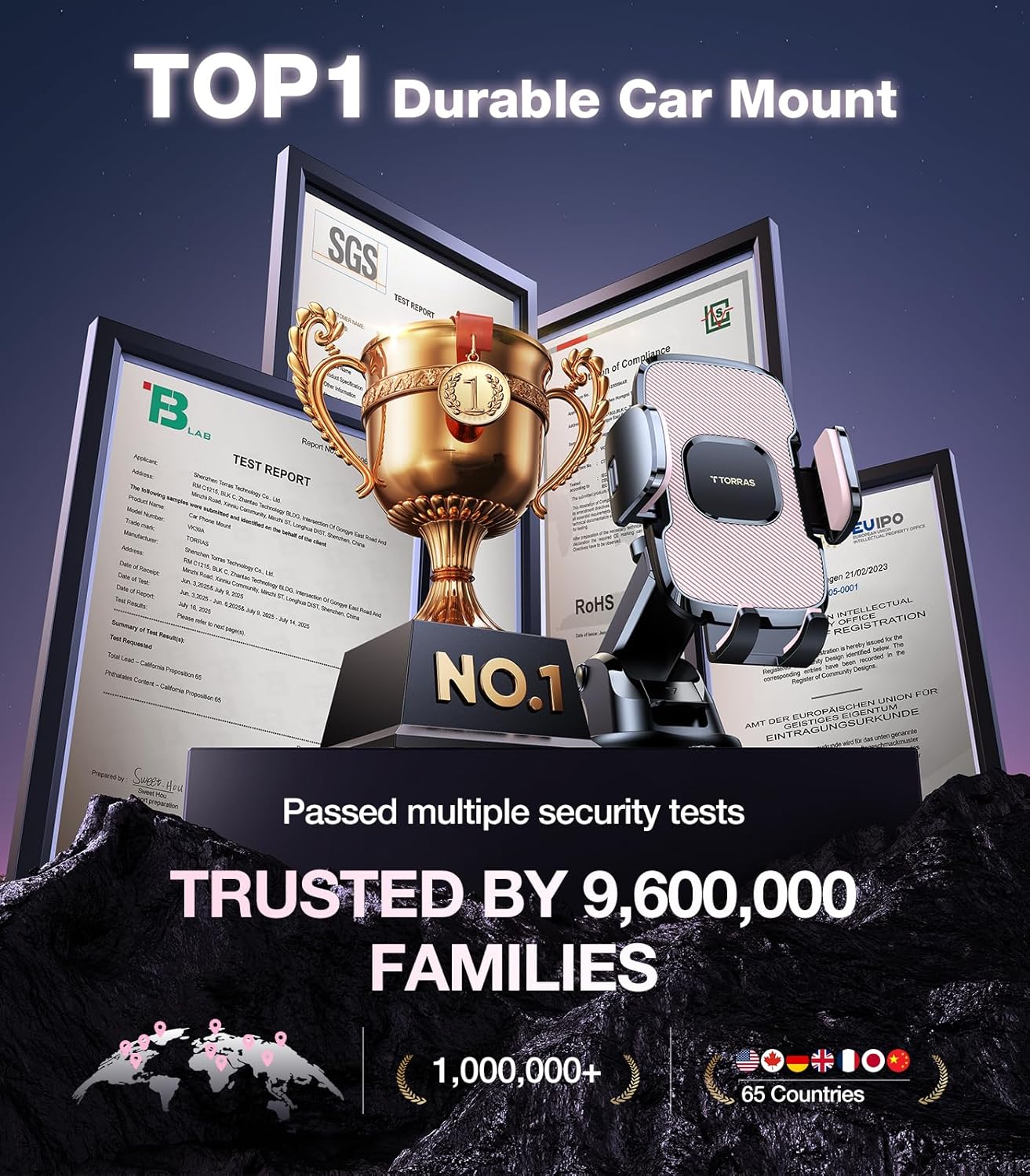 - โถ[MILITARY GRADE STURDINESS TEST]: The 2025 enhanced TORRAS cell phone holder for car passed the military-grade sturdiness test! Absolutely sturdier 20 x than normal ones! The suction cup can withstand the temperature from -20โ๏ผ-4ยฐF) to 95โ/(203ยฐF), also be reusable! You can stick it on your car dash or windshield. Also, you can get a sticky pad to protect your car dash. Completely friendly, hands-free and views-adjustable!