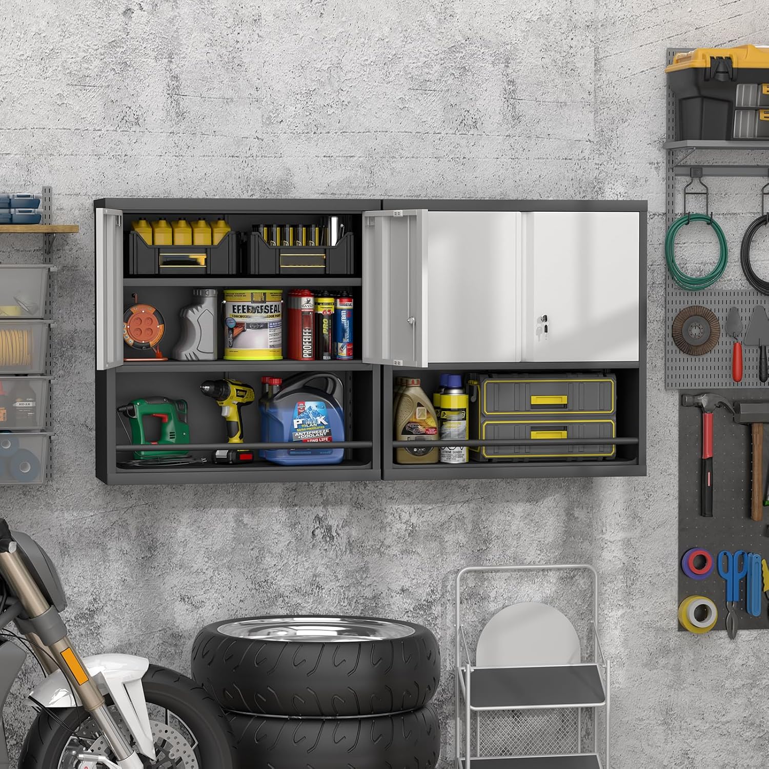 GREATMEET 31" H Locking Metal Garage Storage Cabinet with Doors and Shelves, Lockable Wall Cabinet Storage, Black&Grey Steel Wall Mount Cabinet Hanging Floating for Office Utility Room