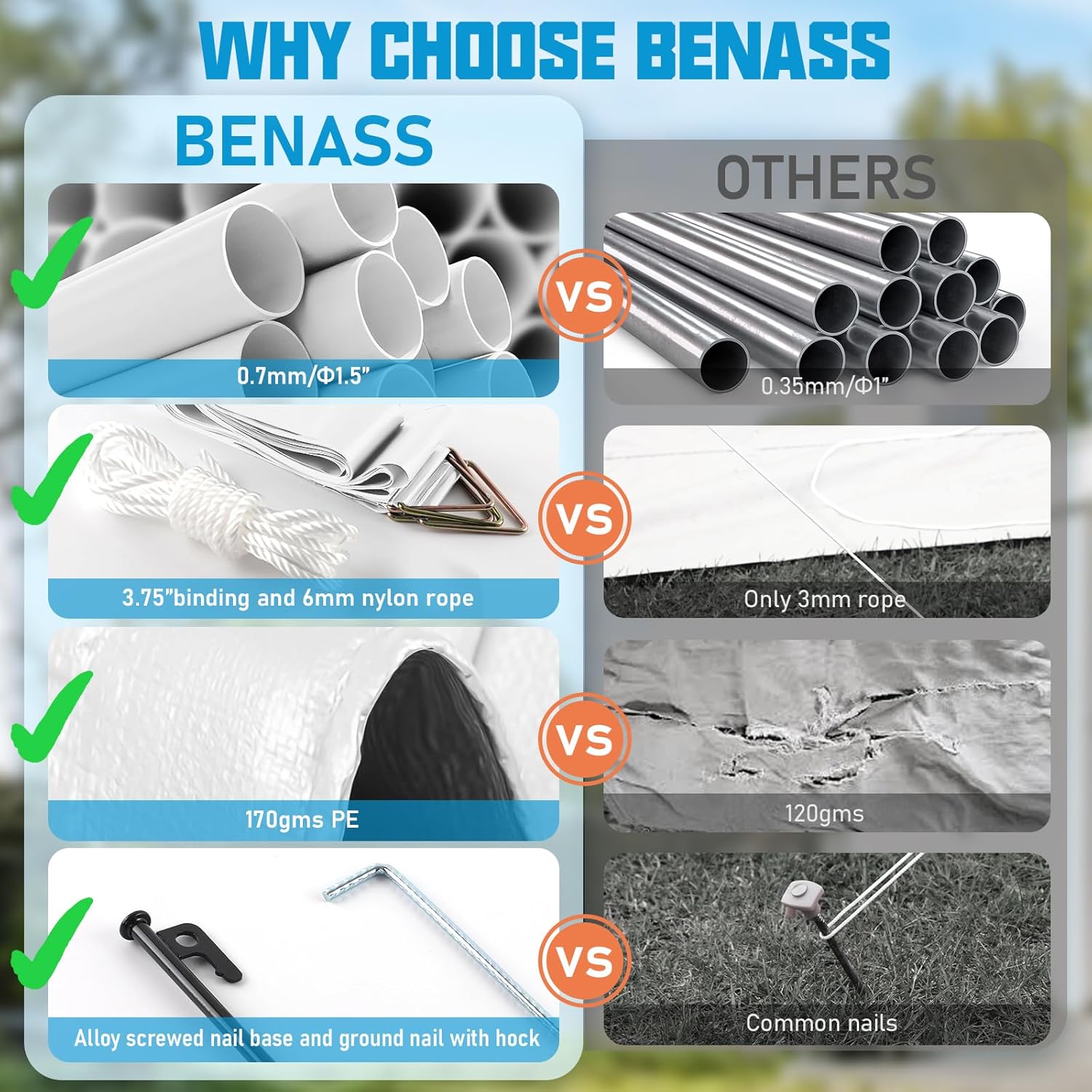 - Super Heavy Duty - Benass portable garage use 1.5" galvanized steel frame and 180gms PE canopy top, is more durable than others. Adding the accessories set, it will be firmer