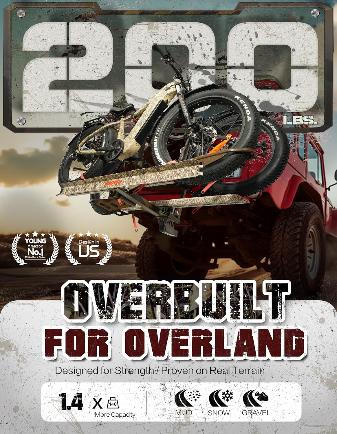 - Off-Road Tested Stability & Safety:This rack features a 3-point locking system, reinforced hitch mount, and anti-wobble tech for maximum security, even on rough terrain. Whether you’re using it as a trailer hitch bike rack, rv bike rack, or bike rack for heavy e-bike, your bikes stay safe—no rattling, no contact, no worries. FMVSS108-compatible brake light (sold separately) ensures legal, visible night driving.