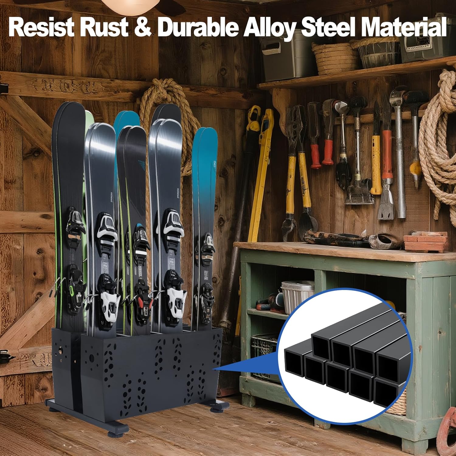 - 【8 PAIRS FREESTANDING SKI RACK】Holds up to 8 pairs of ski + poles. Holds skis up to 140mm wide at the tails, including race skis, all-mountain skis, twin tips, and powder skis. A perfect ski organizer for your garage, or ski lodge.