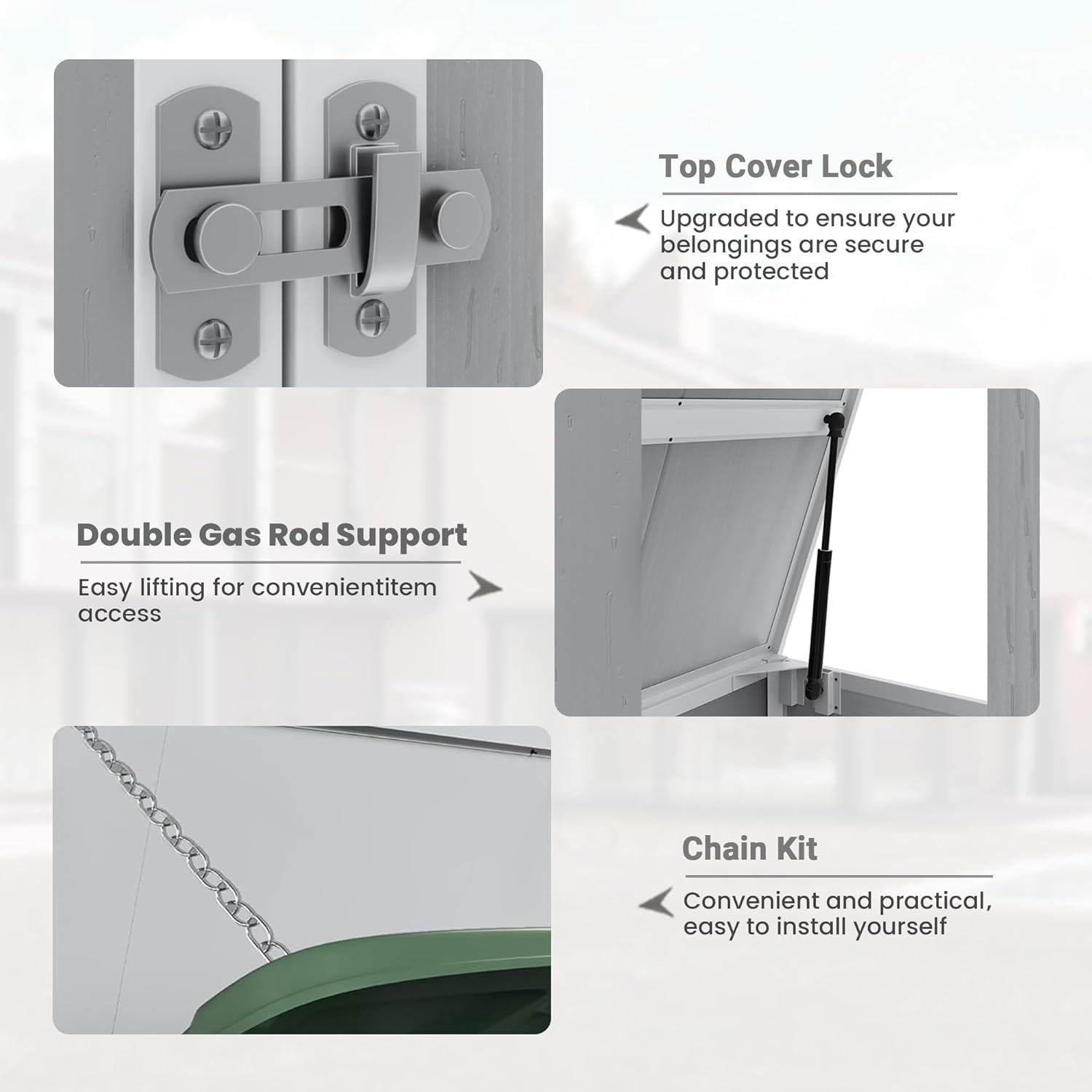 - Secure Outdoor Storage Shed: This shed features a dual-access system with a gas-assisted lid and front-opening doors for easy loading and organizing. The reinforced floor supports heavy items like trash bins or lawn equipment, while lockable doors and a sturdy structure ensure outdoor durability and security
