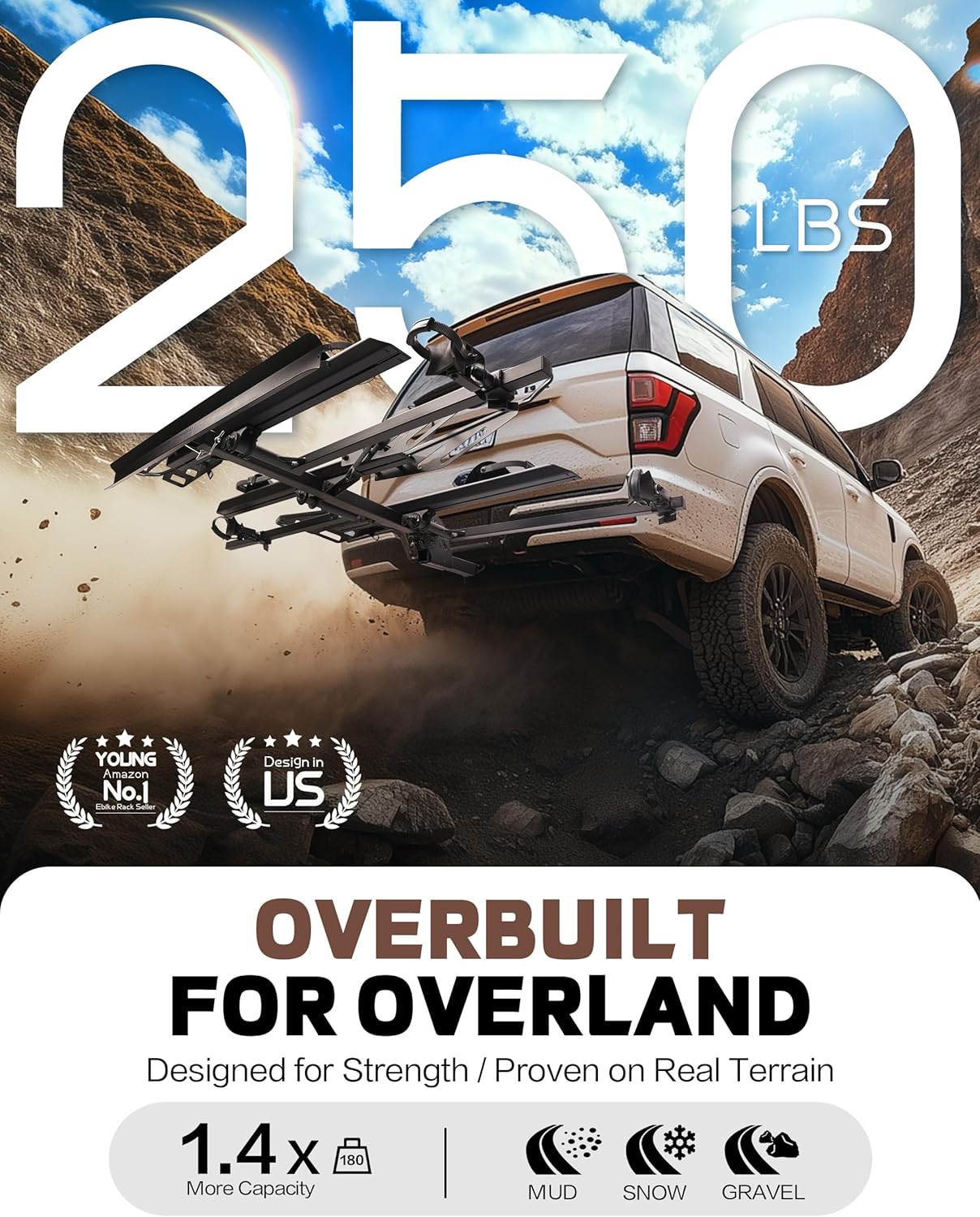 - 250 LB TOTAL CAPACITY: Built for durability and strength, this bike rack boasts an impressive 250lbs capacity, securely accommodating heavier electric bikes or multiple conventional bicycles with ease. Trust in its robust construction for reliable, strain-free transportation.