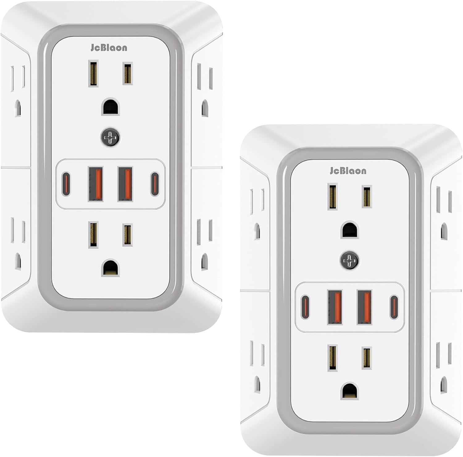 2 Pack Outlet Extender Surge Protector, 6 Outlet Splitter with 4 USB Outlet (2 USB A,2 USB C), 3Sided Power Strip with Adapter Spaced Outlets for Home, Office, Travel(White)