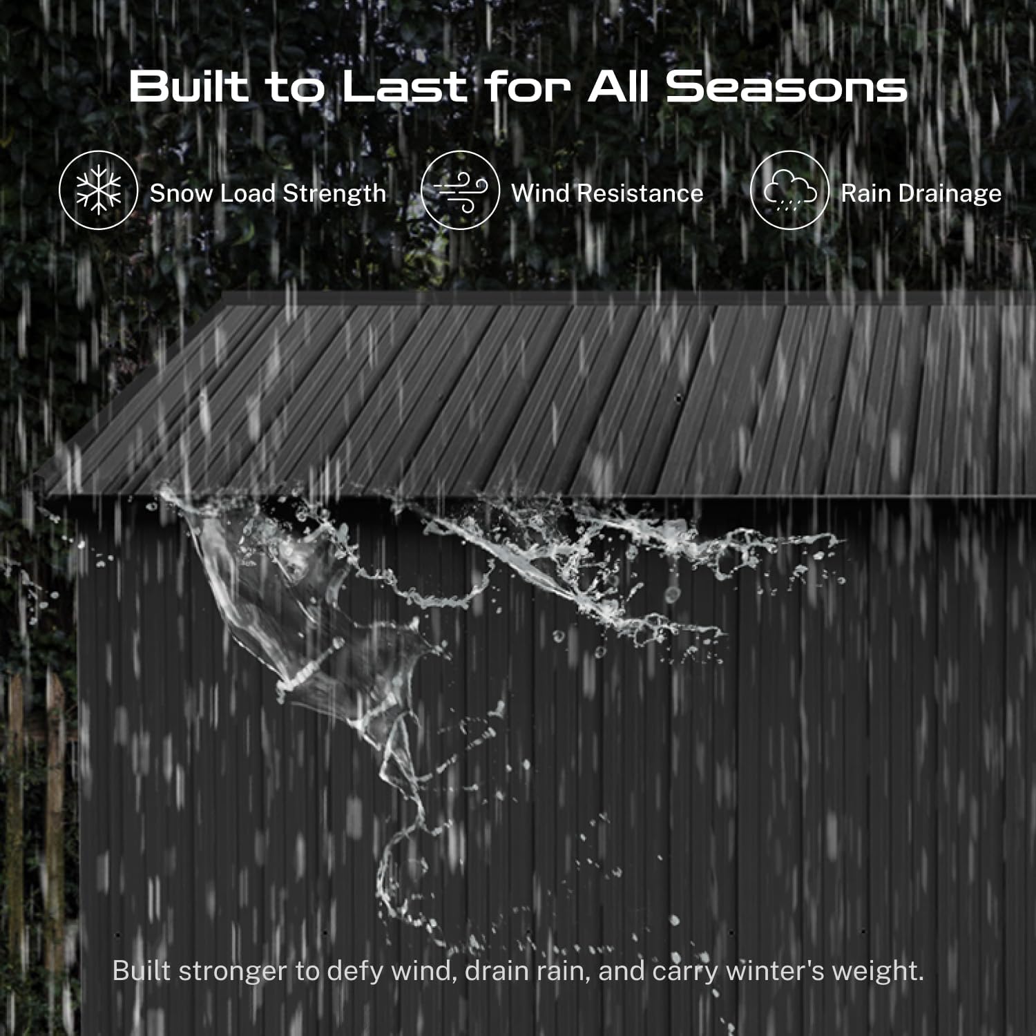 - ☔ [Sloped Roof for Superior Weather Protection] Designed for real-world conditions, the efficient sloped roof system guarantees optimal rainwater drainage, preventing damaging pooling and leaks. This key feature in our storage buildings and sheds clearance design minimizes maintenance and ensures your tools, equipment, and belongings stay consistently dry inside