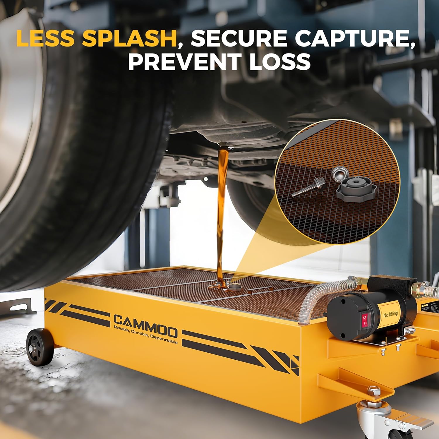- User-Friendly Design:The 32.8" × 16.9" filter screen with smaller holes on oil drain pans minimizes splatters and catches dropped parts, keeping floors clean and saving time. Its 1.2 mm metal frame resists warping, ensuring durability for oil drain pans. The T-handle folds from 40–180°, collapses flat for storage, and reaches easily under vehicles—perfect for maneuvering oil drain pans. Two fixed 4-inch wheels and two 3-inch swivel wheels with brakes ensure stable, secure positioning for oil drain pans—even on slopes. Together, these elements make every oil change with oil drain pans quicker, neater, and hassle-free.