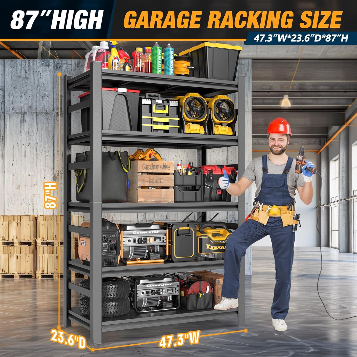 Heavy Duty Commercial Metal Garage Shelving Rack,Adjustable Industrial Steel Storage Shelves for Warehouse, Garage, Basement, 87" H x 47.2" W x 23.6" D, Black