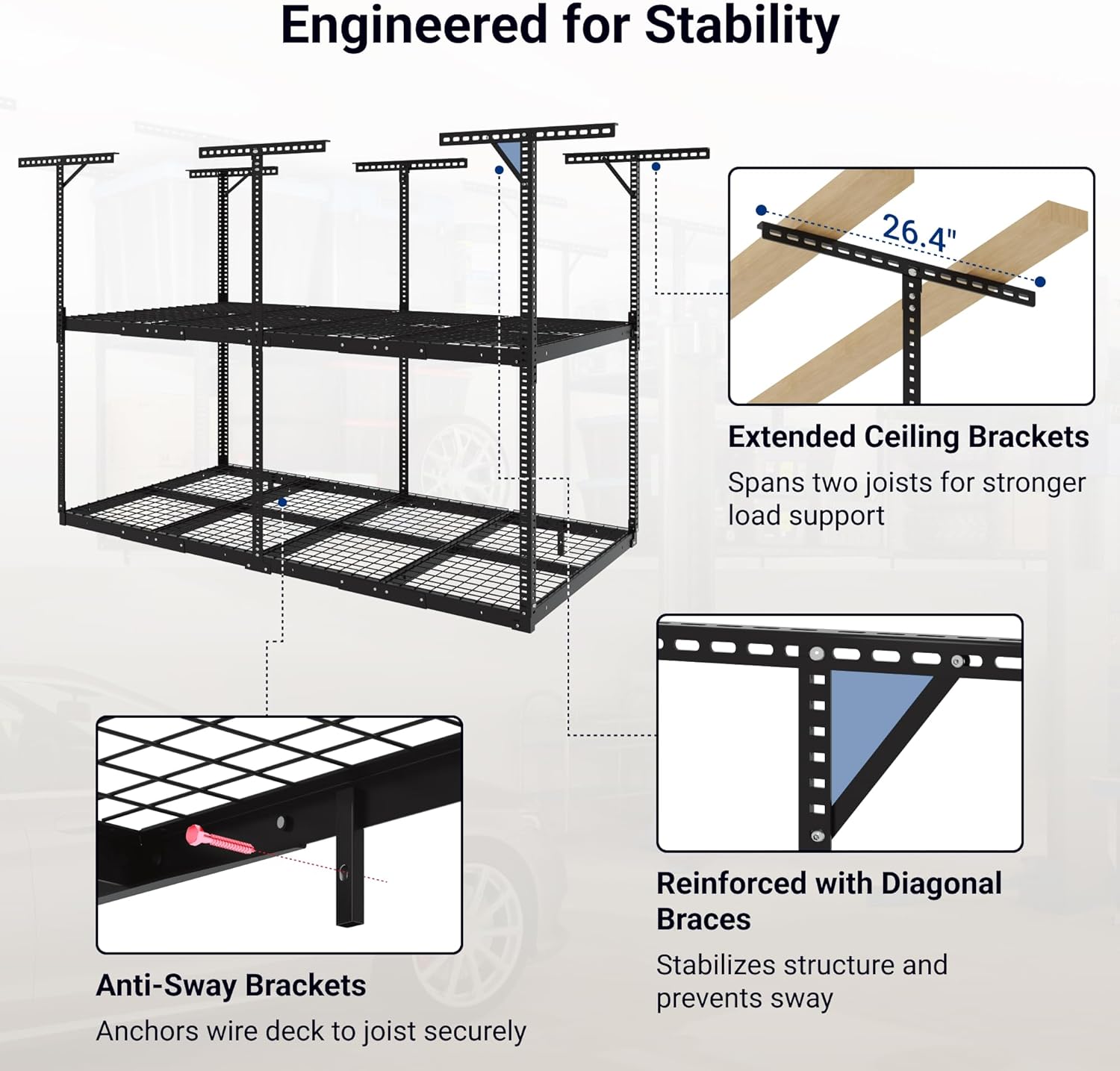 - Heavy Duty Strength, Safety Tested – Built as a heavy duty metal garage ceiling storage rack, tested to 2000 lbs and rated at 1000 lbs. Reinforced with diagonal support bars and anti-sway brackets, it offers unmatched stability for tools, bins, and bulky gear in any garage storage system.