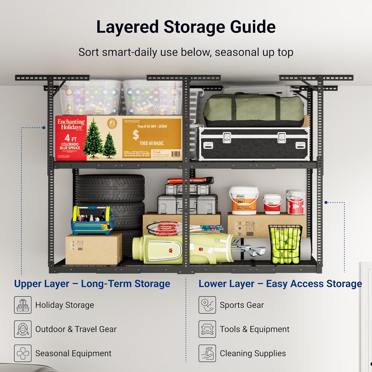 - Maximize Vertical Storage for Tall Garages – The FLEXIMOUNTS 4x8 2-Tier Overhead Garage Storage Rack creates twice the capacity of standard racks, turning unused ceiling space into a clutter free, organized area. Perfect for garage organization in 10–15 ft tall garages. For optimal clearance when parking or walking underneath, 2-tier racks are not recommended for garages under 10 ft.