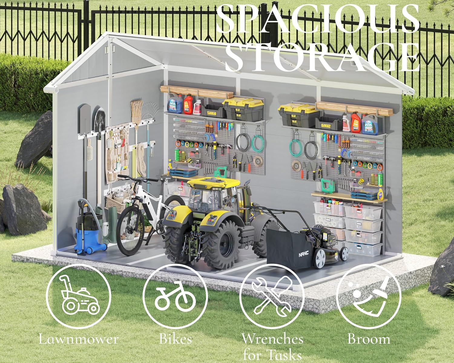 - 【Spacious & Versatile Storage】 With dimensions of 91"(L) x 126"(W) x 90"(H), the sheds can accommodate up to 60+ lawnmowers, 30+ bicycles, or storage racks, making it ideal for use as a storage room, tool shed, or small workshop